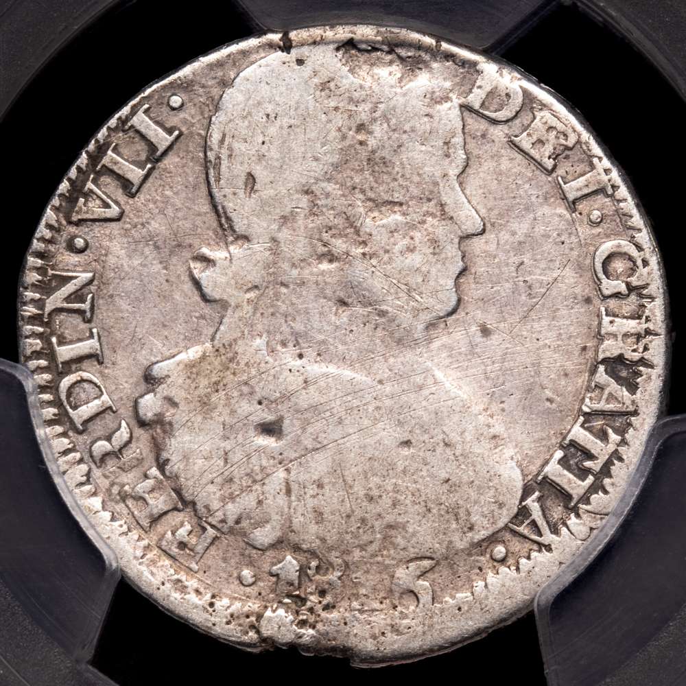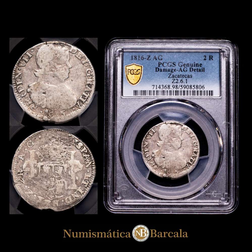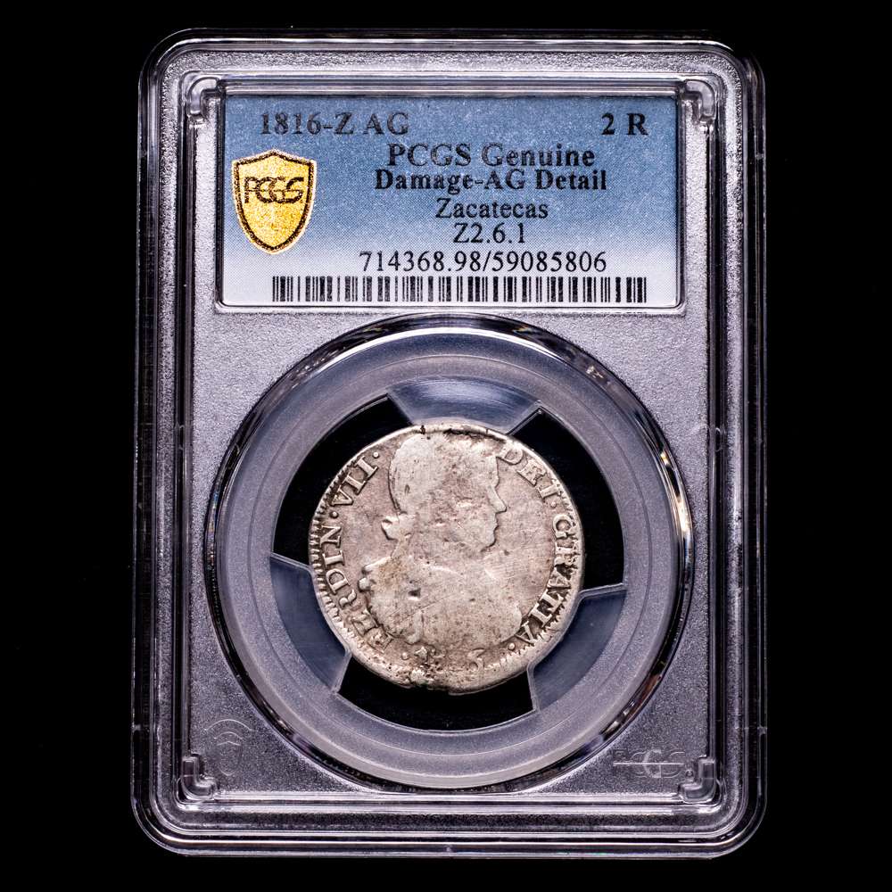 Fernando VII. 2 Reales. (6,77g.). Zacatecas. 1816. A·G. Encapsulada por PCGS como Damage-AG Detail.