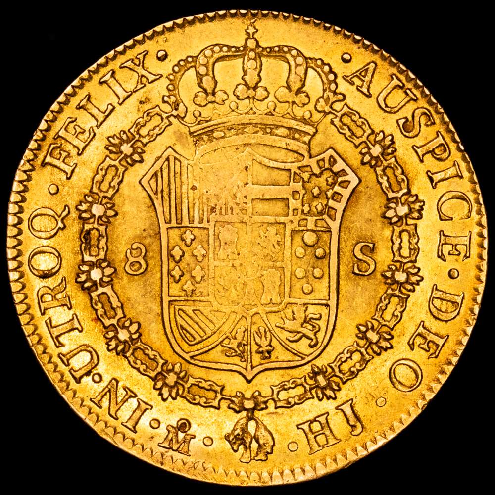 Numismática Barcala > Productos > FERNANDO VII. 8 escudos. 1809. México. HJ. 27,01 g. 36,6 mm. (Cal-1782). (Cal onza-1253). Au. Busto imaginario. Punto entre ET · IND. Restos de brillo original. MBC+.