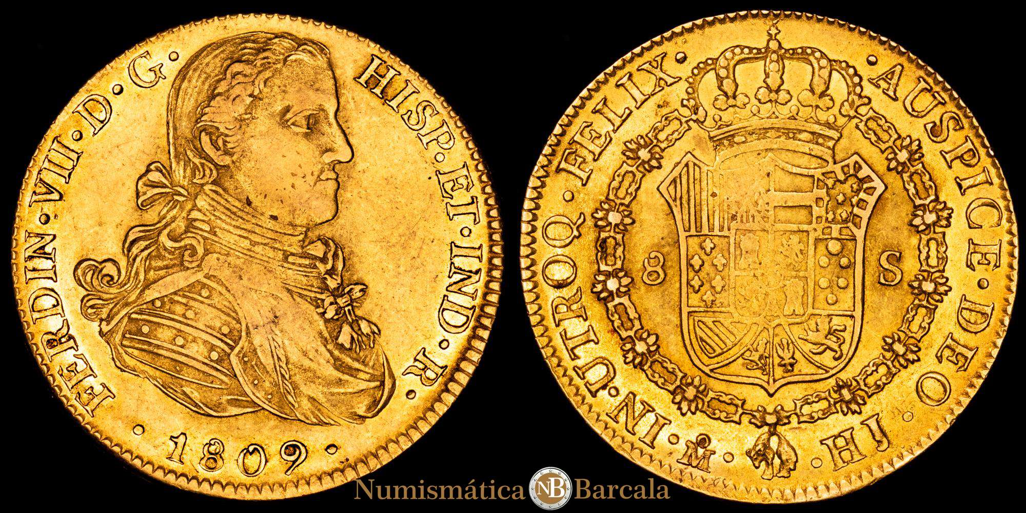 Numismática Barcala > Productos > FERNANDO VII. 8 escudos. 1809. México. HJ. 27,01 g. 36,6 mm. (Cal-1782). (Cal onza-1253). Au. Busto imaginario. Punto entre ET · IND. Restos de brillo original. MBC+.