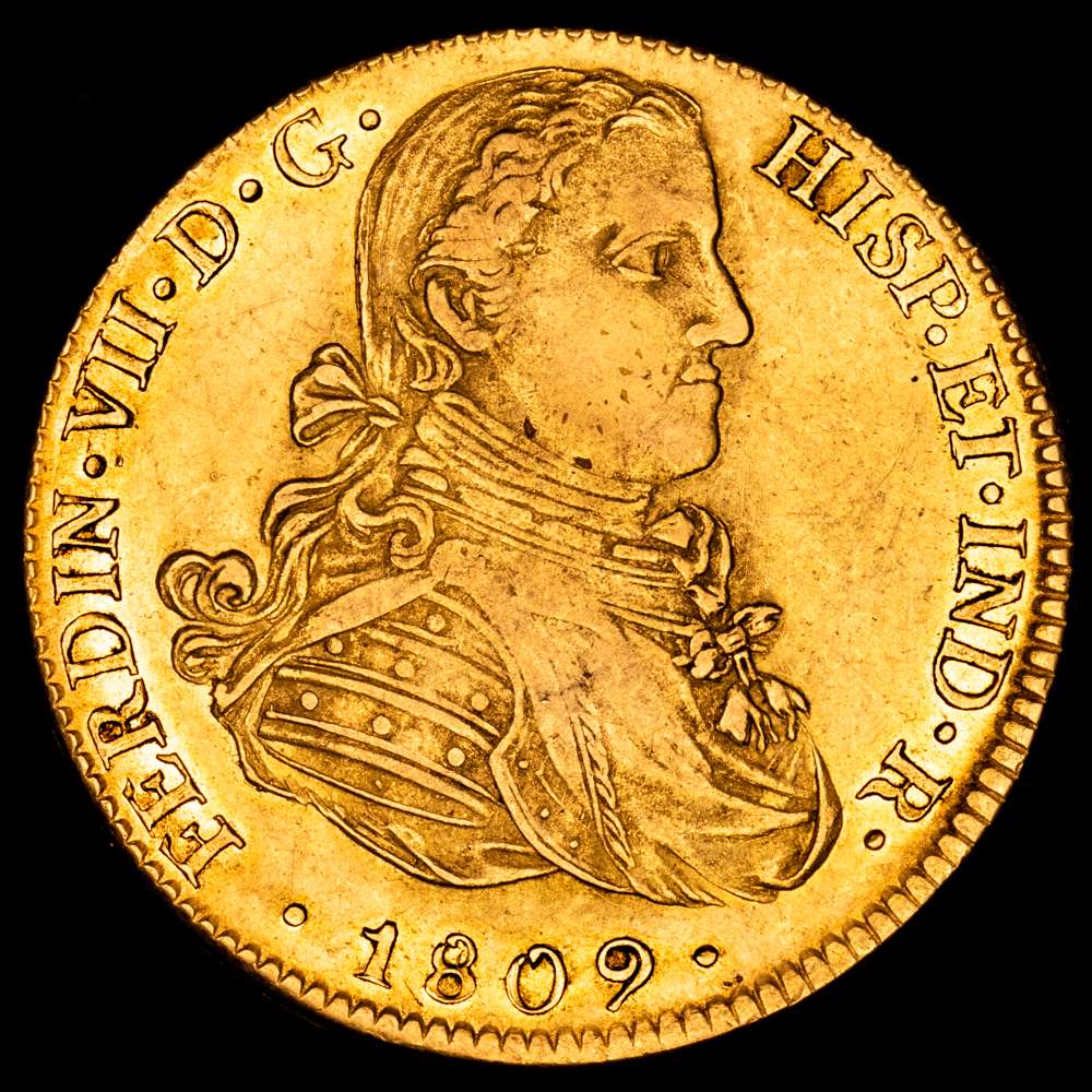 Numismática Barcala > Productos > FERNANDO VII. 8 escudos. 1809. México. HJ. 27,01 g. 36,6 mm. (Cal-1782). (Cal onza-1253). Au. Busto imaginario. Punto entre ET · IND. Restos de brillo original. MBC+.