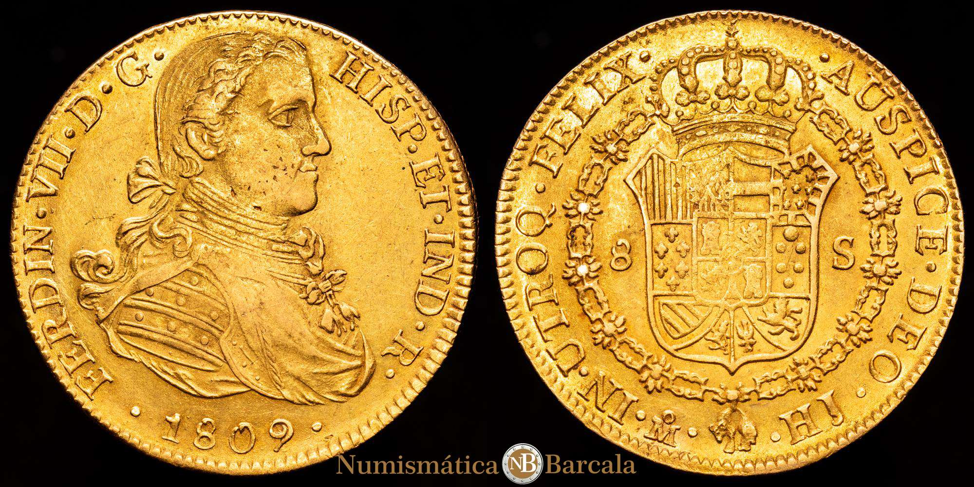 Numismática Barcala > Productos > FERNANDO VII. 8 escudos. 1809. México. HJ. 27,01 g. 36,6 mm. (Cal-1782). (Cal onza-1253). Au. Busto imaginario. Punto entre ET · IND. Restos de brillo original. MBC+.
