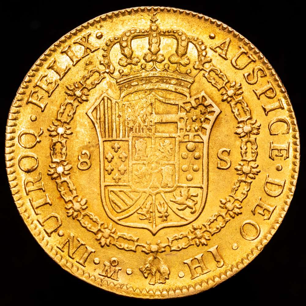 Numismática Barcala > Productos > FERNANDO VII. 8 escudos. 1809. México. HJ. 27,01 g. 36,6 mm. (Cal-1782). (Cal onza-1253). Au. Busto imaginario. Punto entre ET · IND. Restos de brillo original. MBC+.