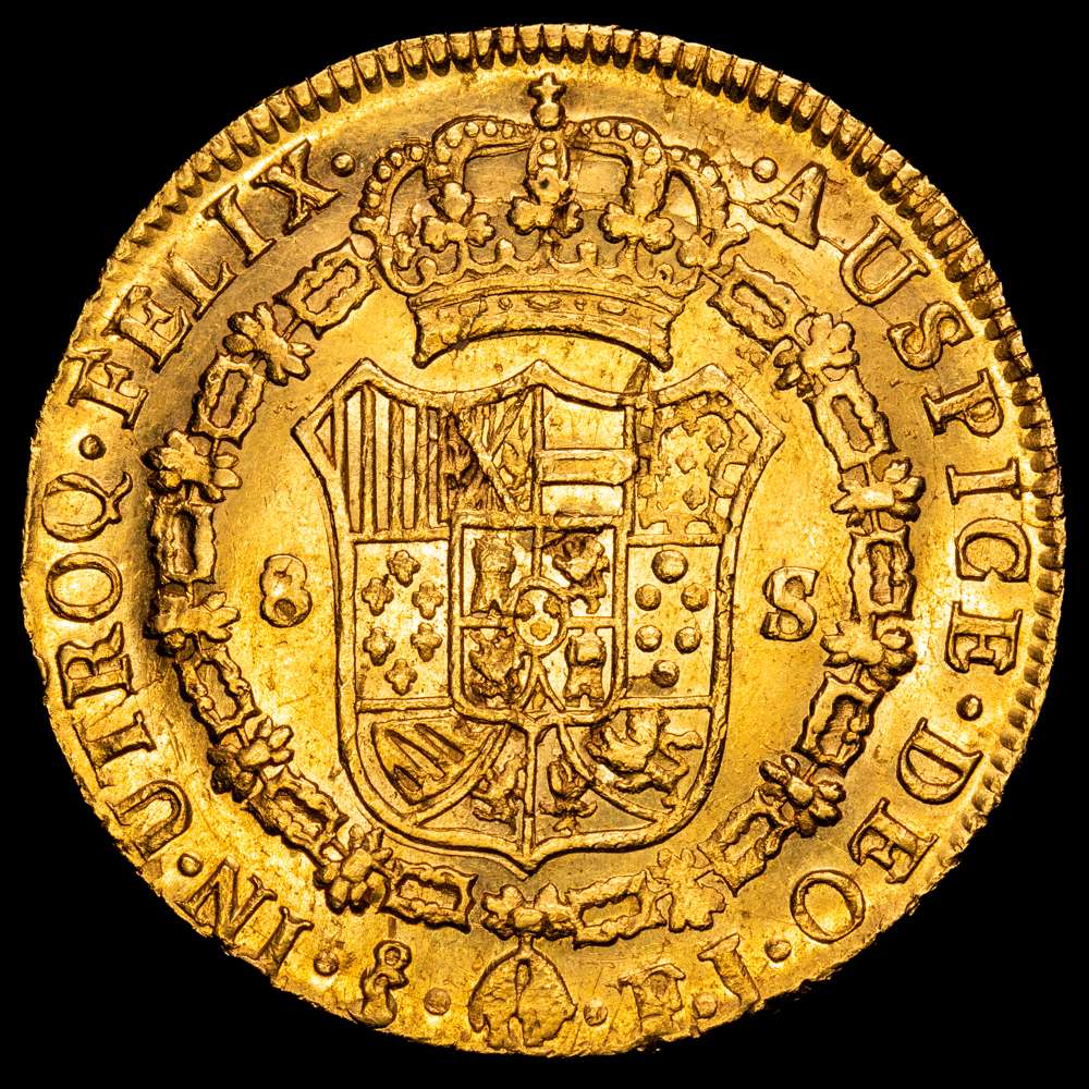 Precioso y escaso ejemplar. Entre 1808 y 1811 se acuña, de manera exclusiva en la ceca de Santiago de Chile, este icónico busto imaginario conocido como busto almirante. Es una moneda perfecta para que los historiadores militares puedan estudiar y clarificar cómo eran los uniformes militares de la época: Fernando VII viste casaca de cuello alto, puesta de moda a finales del siglo XVIII, a la que acompaña algún elemento decorativo como la chorrera pero a la que no acompaña ningún distintivo militar más que la cadena propia de la Orden del Toisón. El pelo del monarca también es muy interesante para comprobar cómo, definitivamente, se dejaron atrás las pelucas propias del Barroco, y su sustitución, en este caso, por un pelo largo y blanqueado, como homenaje a los oficiales de la Marina.