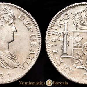 Fernando VII. 8 Reales. (27,31 g.). Zacatecas. 1821. Ensayador R·G. Aureo y Calicó-1465. EBC+.