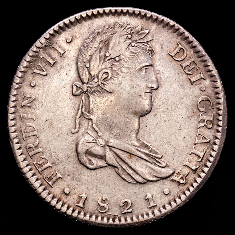 KM-111.3 (AC-1209) – 8 Reales 1821/18 Guadalajara Ga FS. XF.- (26,88 gramos). Sobrefecha bastante escasa. Emisión que confirma ser la primera en secuencia tras el segundo cierre de la ceca en junio de 1818, con mínimas diferencias en el diseño del busto, mientras que el reverso corresponde exactamente a uno de los cuños utilizados en 1818. RARA en cualquier grado y sumamente difícil de encontrar en mejor estado. Suave pátina en el anverso e irisada en reverso.
