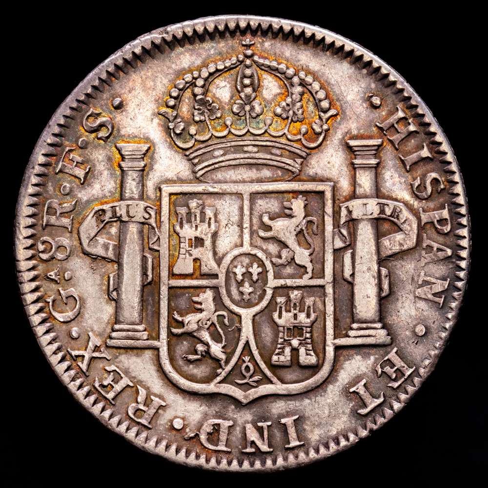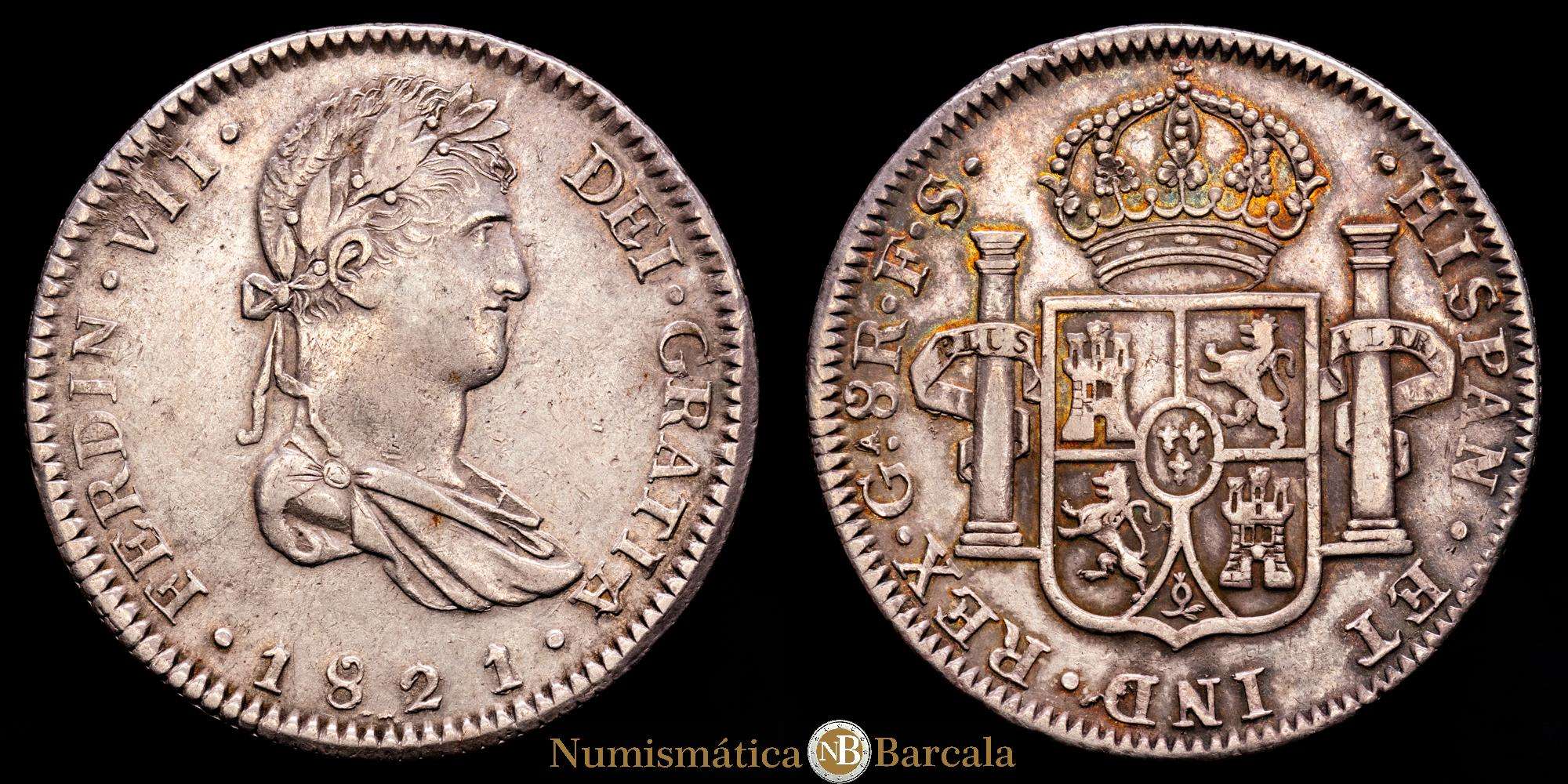 KM-111.3 (AC-1209) – 8 Reales 1821/18 Guadalajara Ga FS. XF.- (26,88 gramos). Sobrefecha bastante escasa. Emisión que confirma ser la primera en secuencia tras el segundo cierre de la ceca en junio de 1818, con mínimas diferencias en el diseño del busto, mientras que el reverso corresponde exactamente a uno de los cuños utilizados en 1818. RARA en cualquier grado y sumamente difícil de encontrar en mejor estado. Suave pátina en el anverso e irisada en reverso.