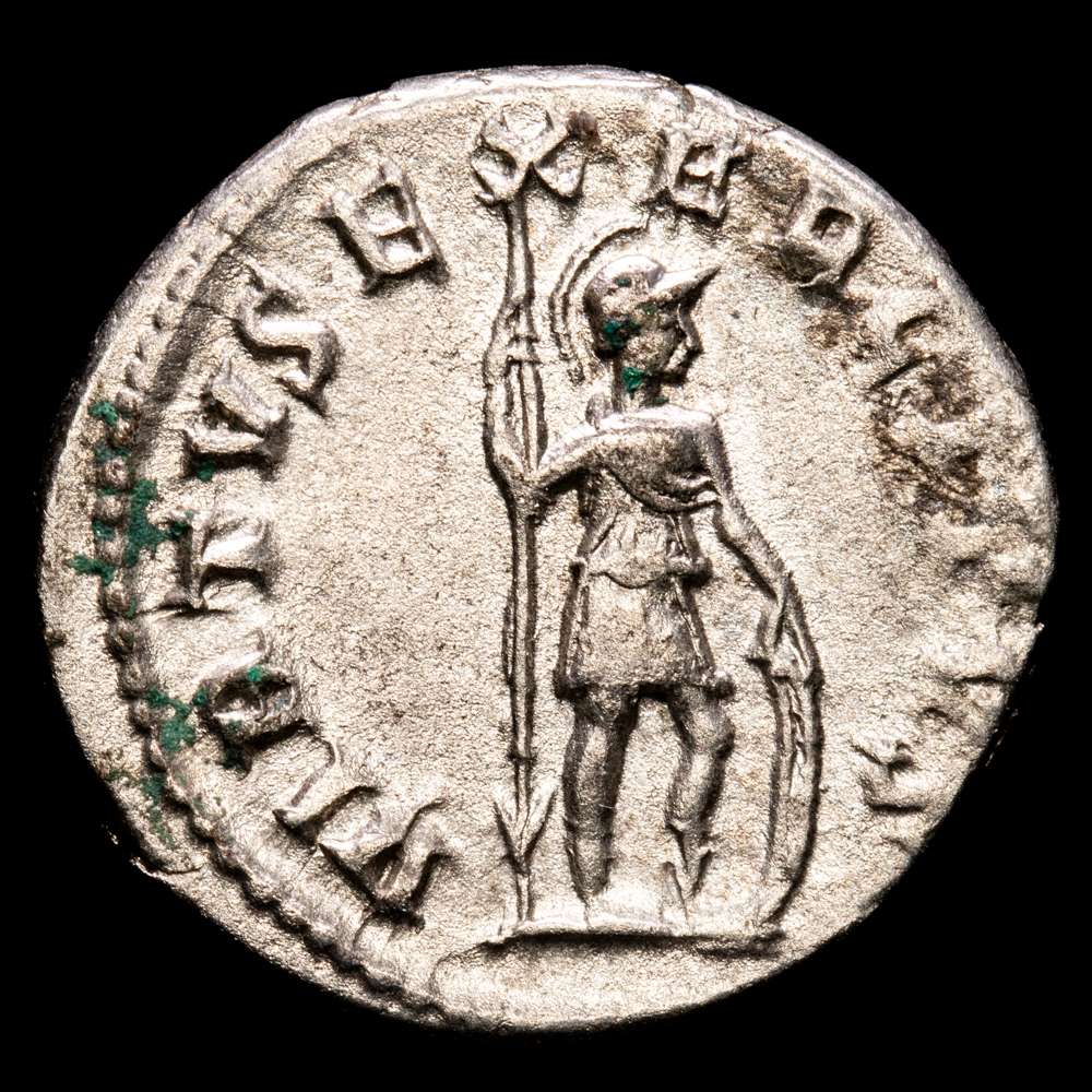 VIRTVS EXERCITVS Virtus de pie a la derecha, portando una lanza en la mano derecha y apoyando la izquierda en un escudo apoyado en el suelo.