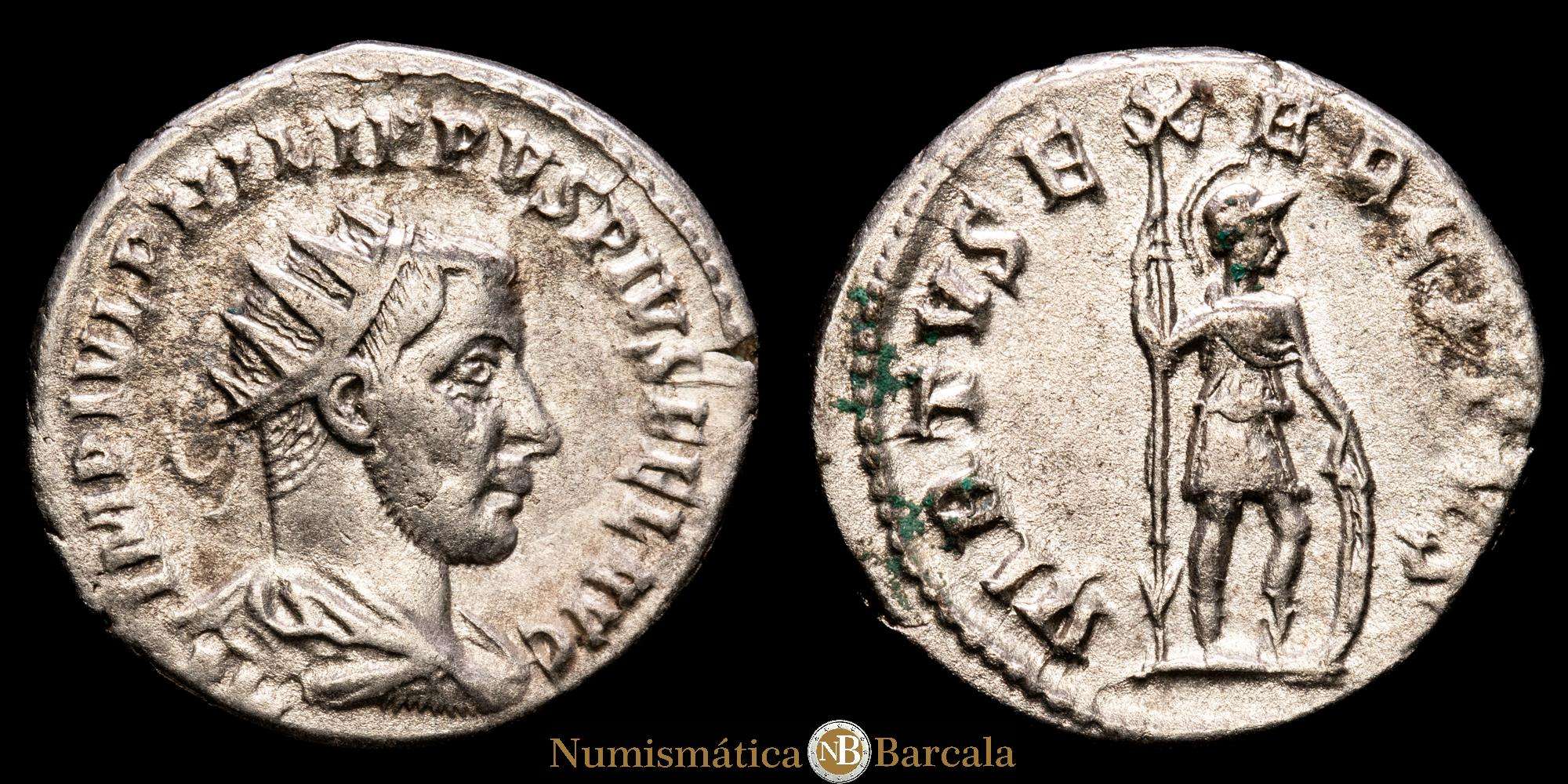 IMP IVL PHILIPPVS PIVS FEL AVG / P M Busto radiado, drapeado y con coraza de Filipo I a la derecha, visto desde atrás.