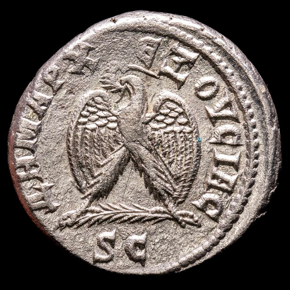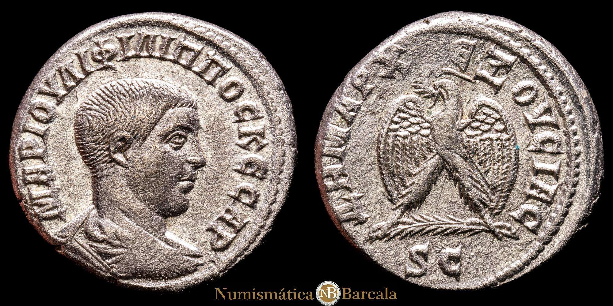 Filipo II. Seleucis y Pieria. Tetradracma. 244-249 d.C. Antioquía. (Prieur-331). (McAlee-1006). Anv.: MAP IOYΛΙ ΦΙΛΙΠΠΟC ΚΕCAP. Busto desnudo y drapeado a la derecha. Rev.: ΔHMAPX EΞOYCIAC. Águila en pie, de frente, sobre palma, con la cabeza a la izquierda, con las alas desplegadas, sosteniendo una corona en el pico; S C en exergo. Ag. 11,87 g. XF.