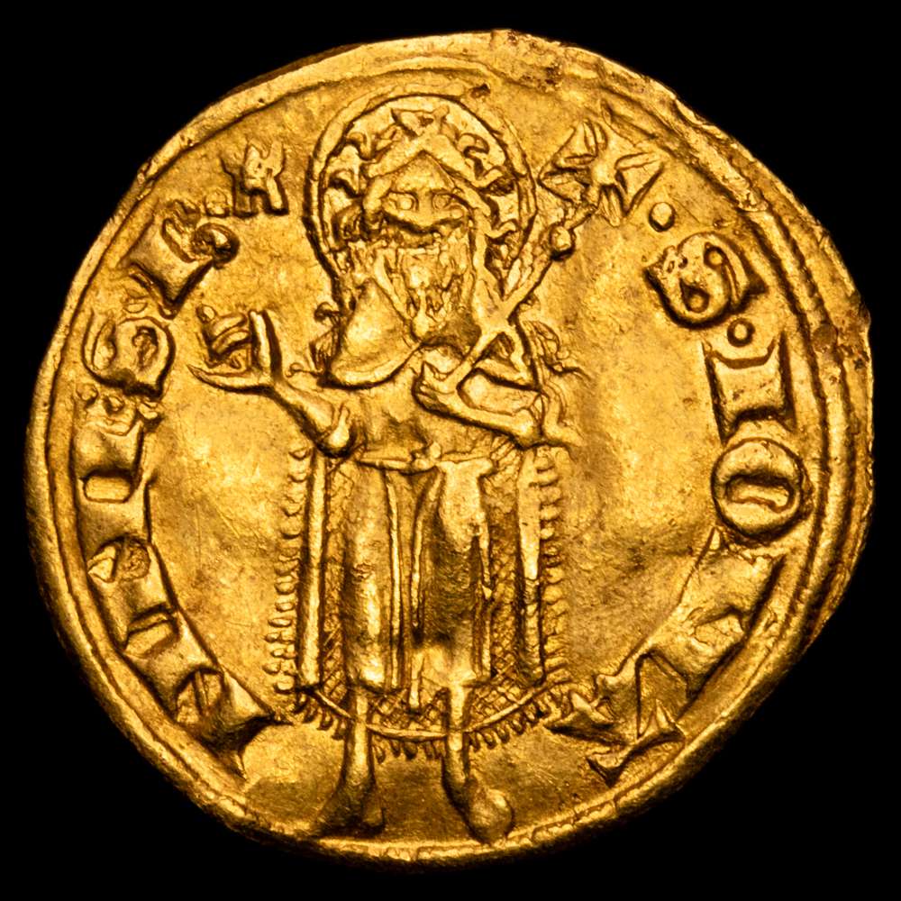Descripción del reverso: San Juan Bautista de pie, de frente, aureolado, vistiendo una piel de camello, sosteniendo un cetro cruciforme en su mano izquierda y bendiciendo con su mano derecha