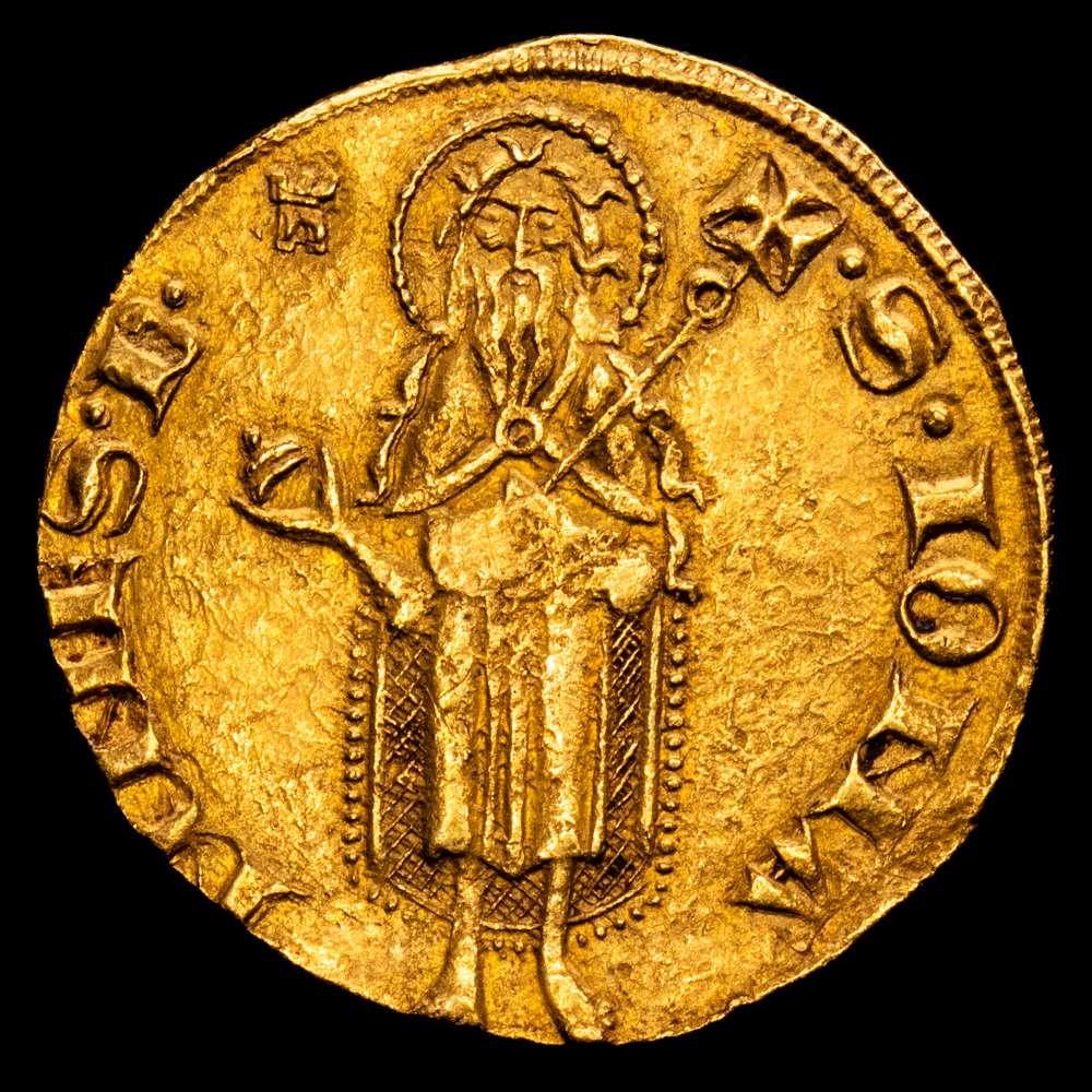 Reverso: + S. IOHA – NNES. B. (marca de ceca). San Juan Bautista de pie, mirando al frente, sosteniendo un báculo rematado por una cruz (la de la leyenda).