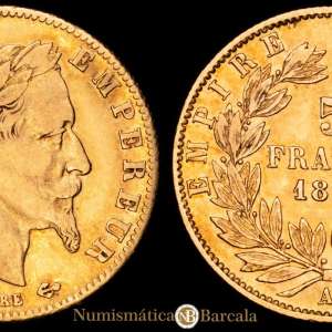 Numismática Barcala > Productos > Francia – Napoleón III. 5 Francs. (1,59 g.). París (A). 1864. KM-803.1. MBC+. Restos de brillo original.