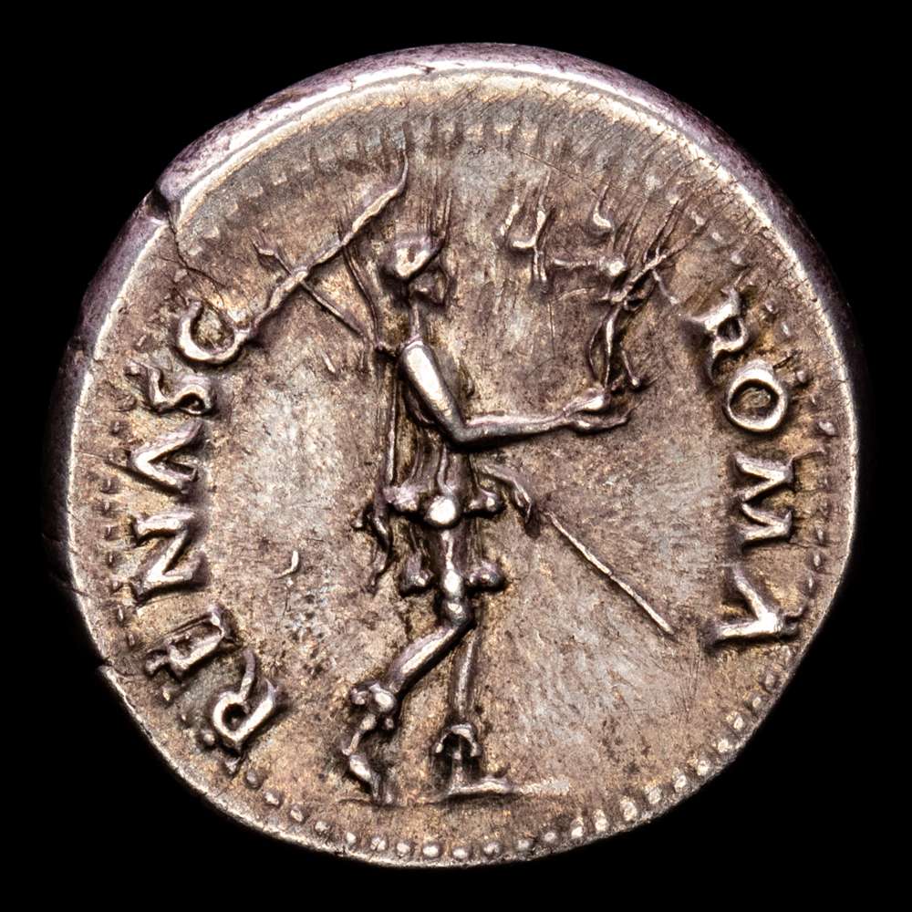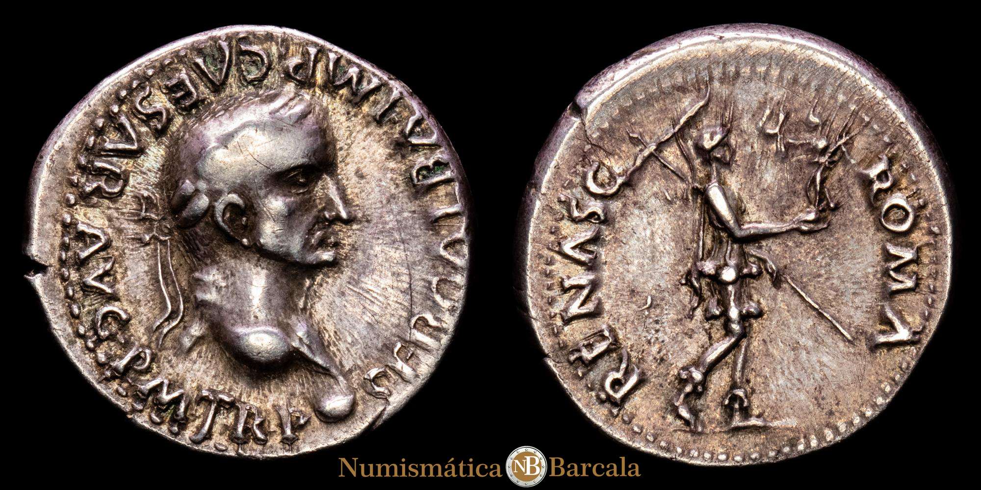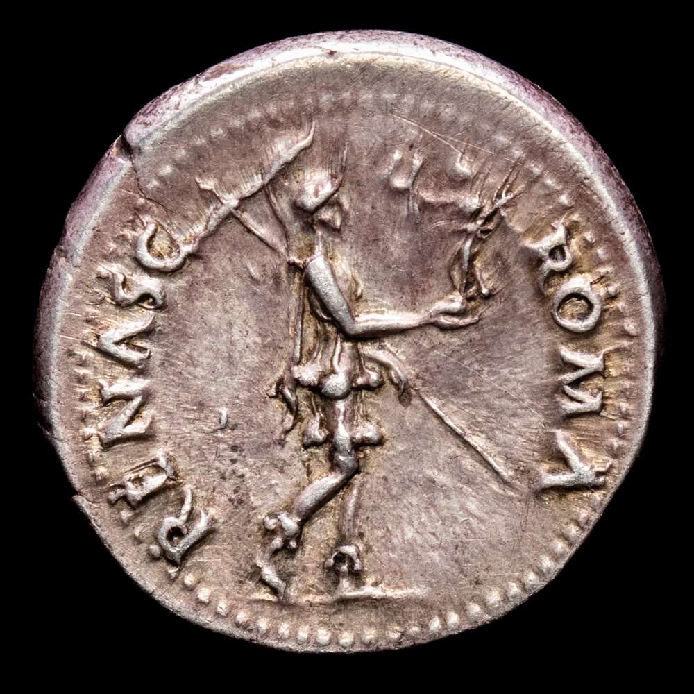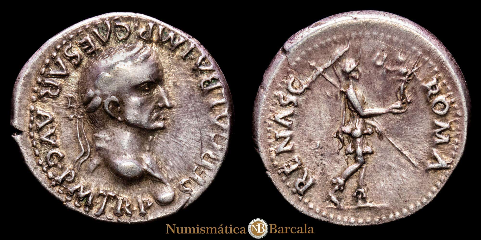 Galba. Denario. 68 d. C. Tarraco. (Ric-57). (Acip-4188). (Bmc-181). Anv.: SER GALBA IMP CAESAR AVG PM TR P. Cabeza laureada a la derecha, con un globo terráqueo en la punta del busto. Rev.: RENASC ROMA. Roma, con casco y vestimenta de militar, avanzando hacia la derecha sosteniendo la Victoria sobre un globo terráqueo y una lanza transversal. Ag. 3,38 gramos. Precioso tono. Muy rara, aún más en esta conservación. Excepcional para el tipo.