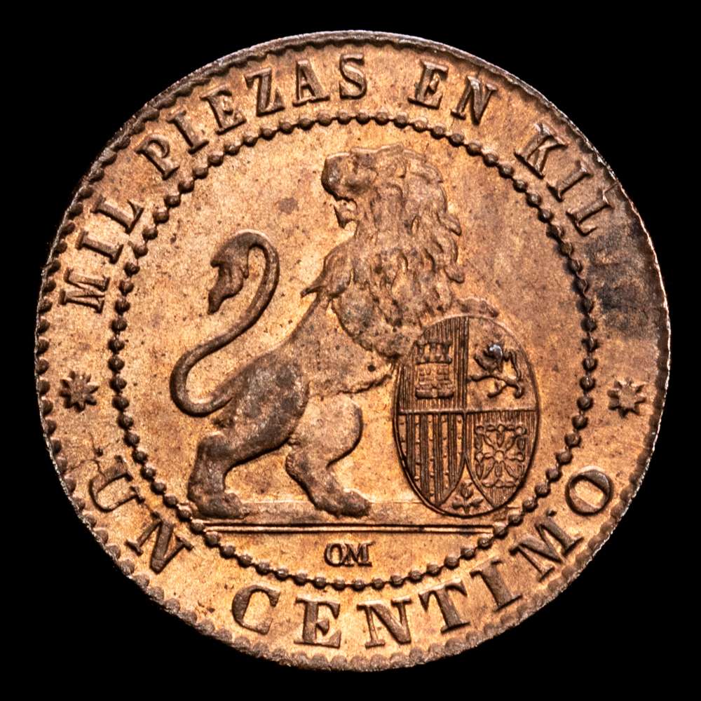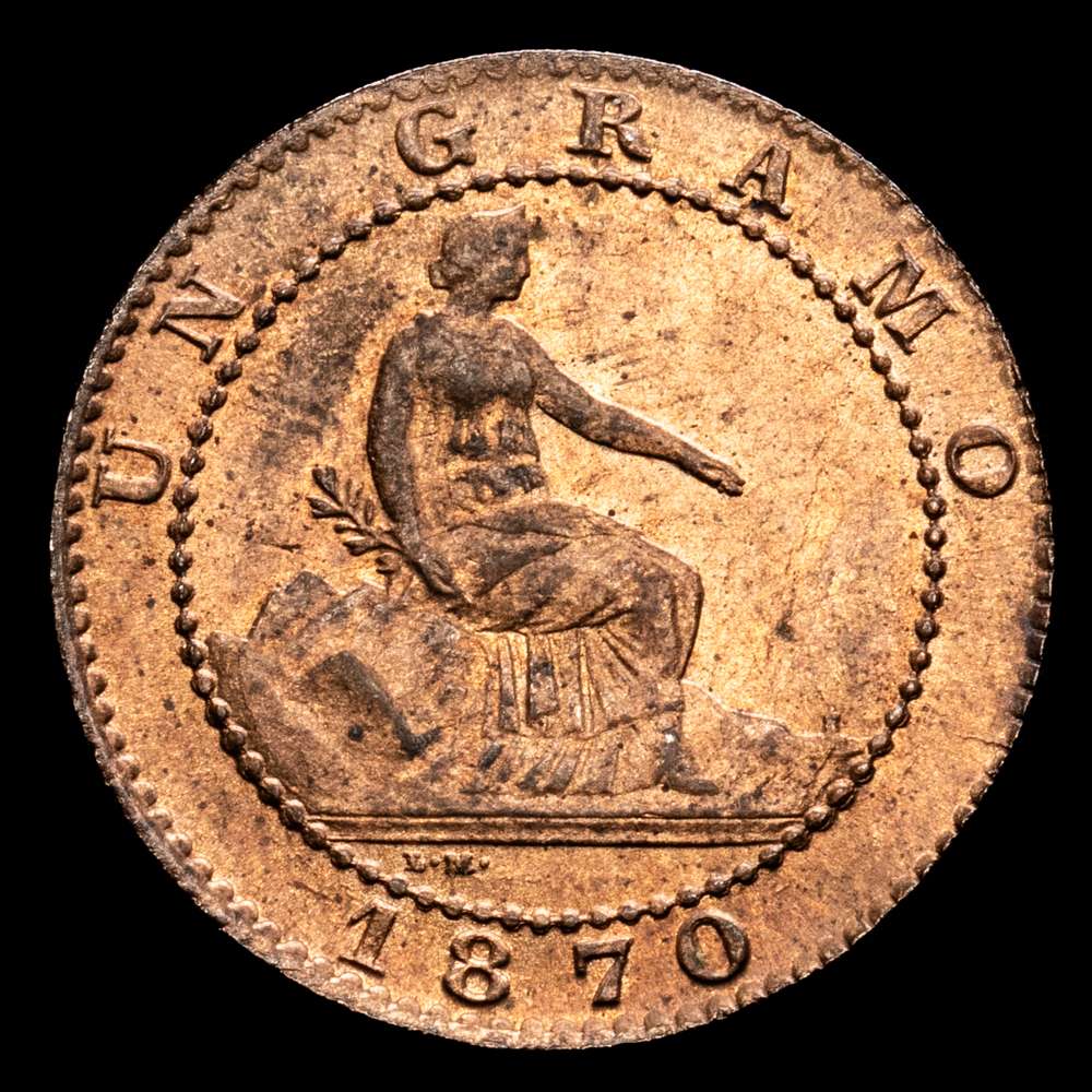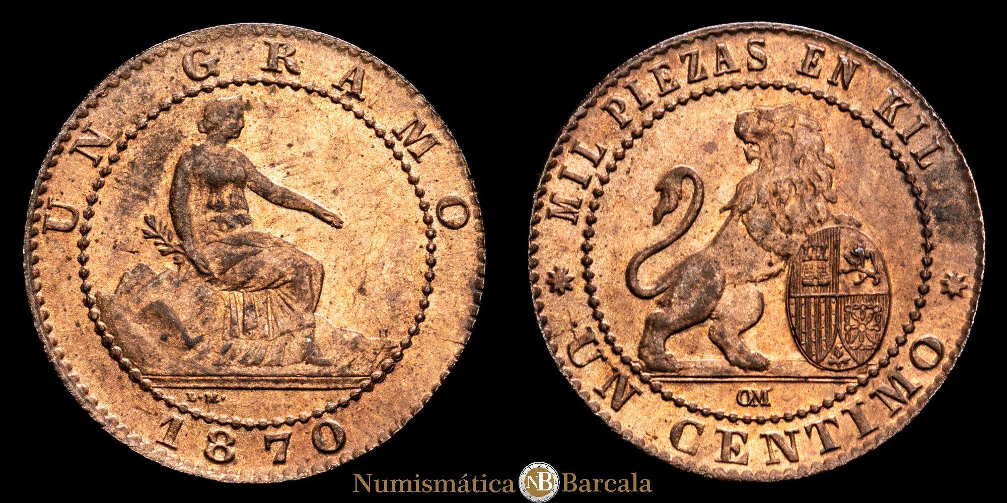 Gobierno Provisional (1868-1871). 1 céntimo. 1870. Barcelona. OM. (Cal-3). Ae. 1,01 gramos. Brillo original. UNC.