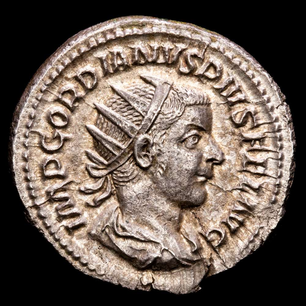 Anv.: IMP GORDIANVS PIVS FEL AVG. Busto laureado, drapeado y con coraza, a la derecha.