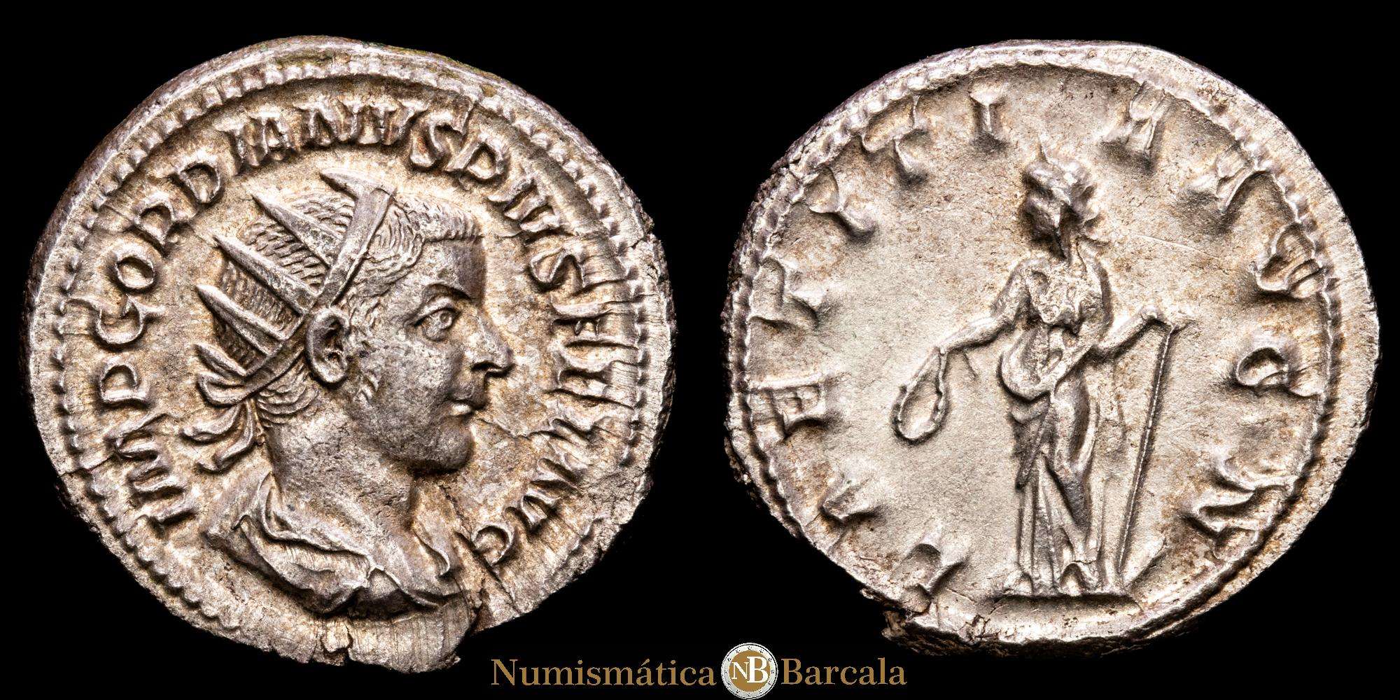 Anv.: IMP GORDIANVS PIVS FEL AVG. Busto laureado, drapeado y con coraza, a la derecha.