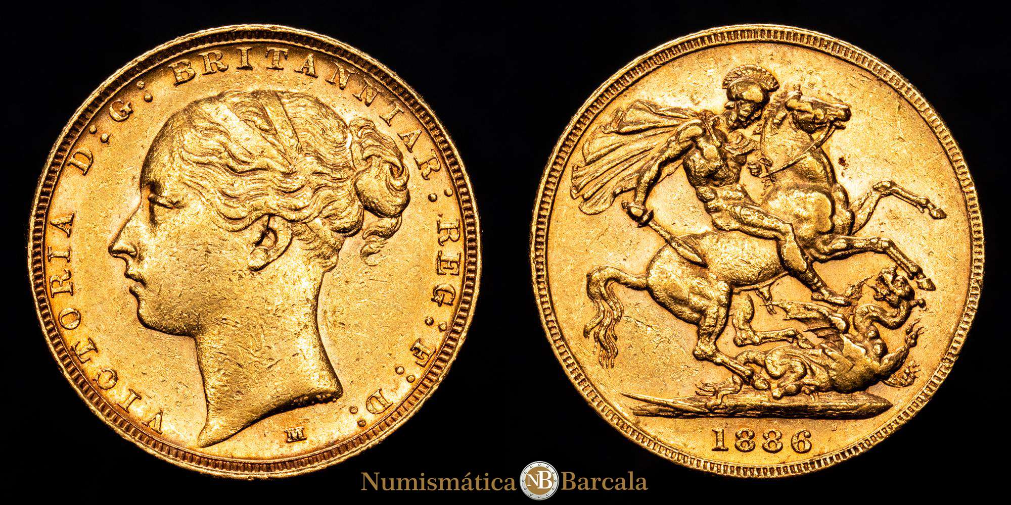 Numismática Barcala > Productos > Gran Bretaña (Australia) , Victoria, 1837-1901. Soberano de oro (22 mm, 7,99 g), 1886 M. Melbourne. KM7, S-3857C. XF+.