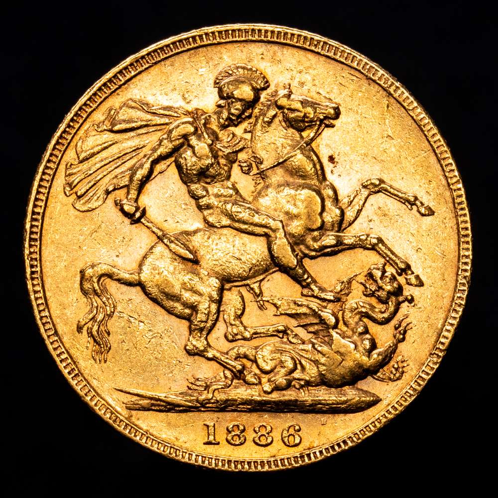 , Victoria, 1837-1901. Soberano de oro (22 mm, 7,99 g), 1886 M. Melbourne. KM7, S-3857C. Cabeza joven a la izquierda, WW completa, marca de ceca M debajo; VICTORIA D: G: BRITANNIAR: REG: F: D:. Reverendo San Jorge a caballo matando al dragón a la derecha, caballo con cola corta; fecha 1886. XF+.