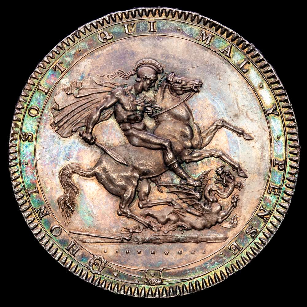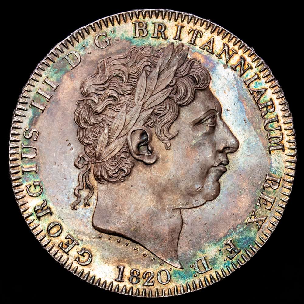 S-3787; KM-675. Variedad sobrefechada. Procedente del último año del reinado de Jorge III, esta impresionante y majestuosa Corona, casi una gema, ofrece una elegante iridiscencia en el anverso y reverso, contrastando con el retrato de Jorge sobre un fondo arcoíris y cautivador con su imponente belleza.