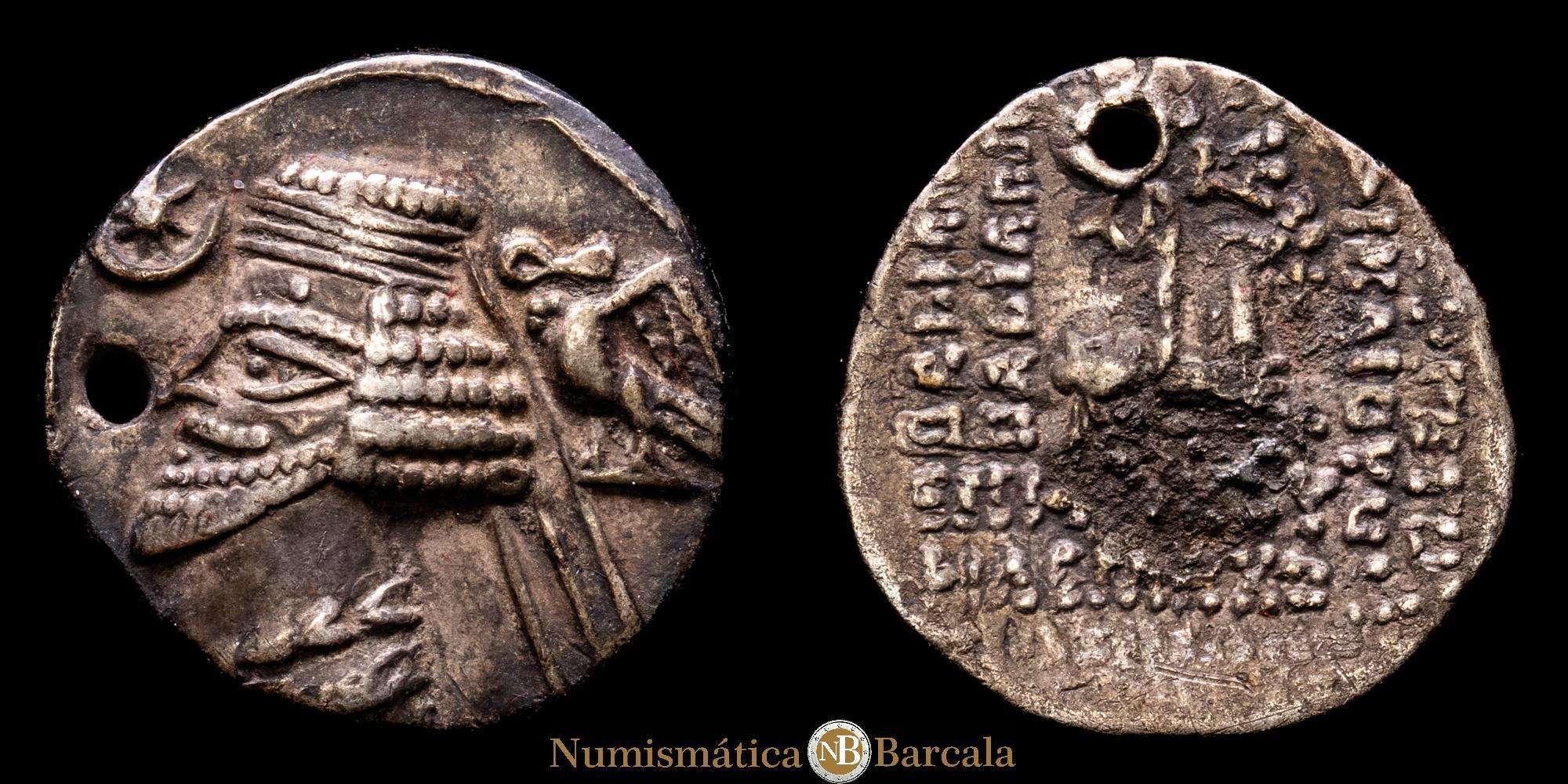 Numismática Barcala > Productos > GRECIA ANTIGUA. Reino de Partia. Fraates IV (38-2 aC). Dracma. Ecbatana. AR 3,74 gramos. 19 mm. SEP-54.7. (MBC-). Agujero a las 12h.