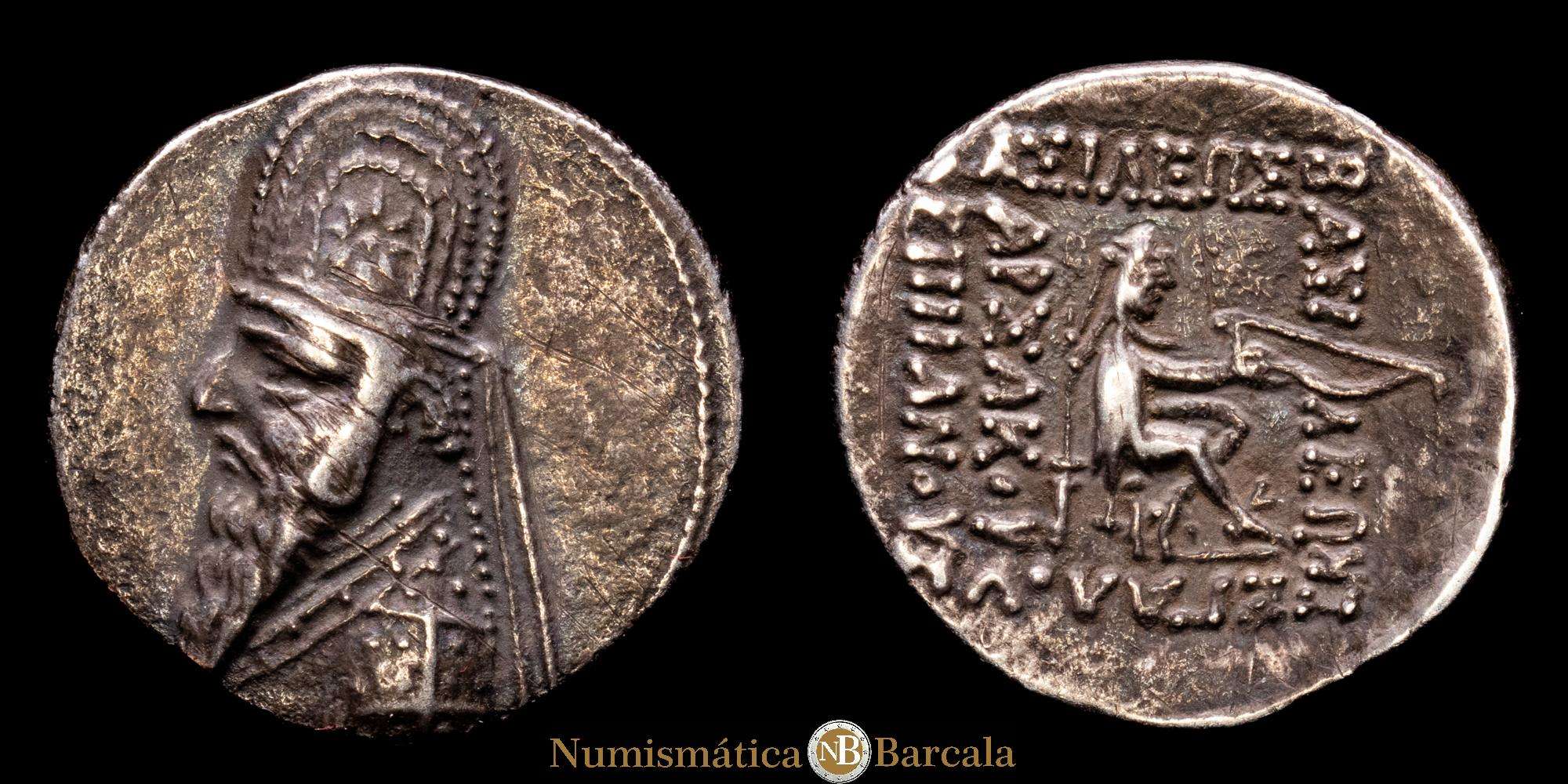 Numismática Barcala > Productos > GRECIA ANTIGUA. REINO DE PARTIA. Mitrídates II. Dracma de plata, circa 96-92 a. C. Rhagai. Sellwood-28.1; Shore-95; Sunrise-296. 3,83 g. Muy buena conservación.