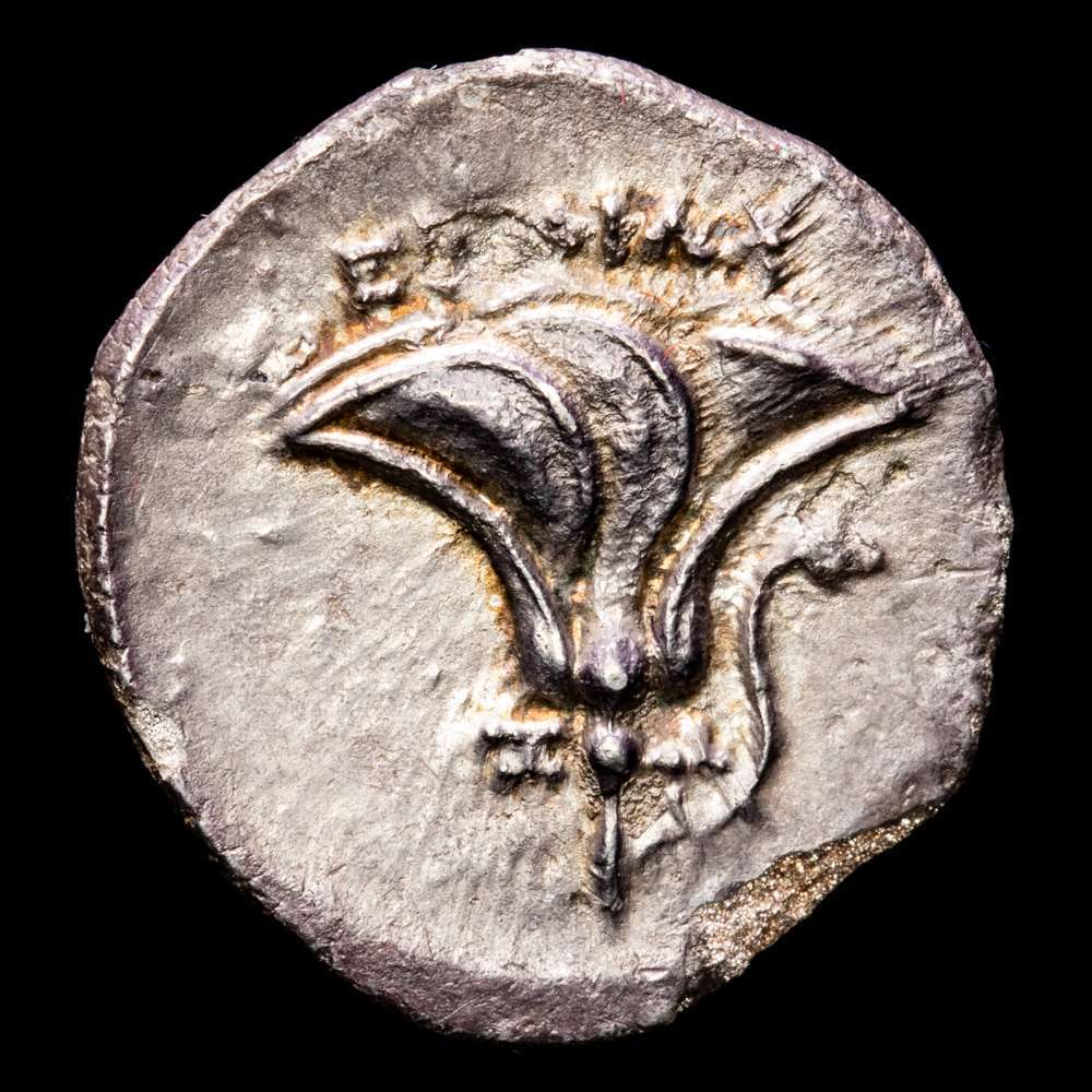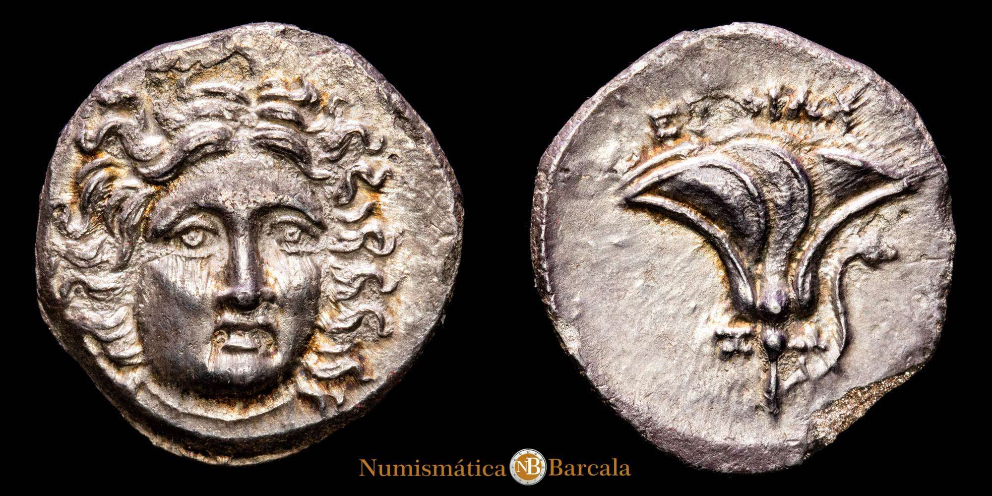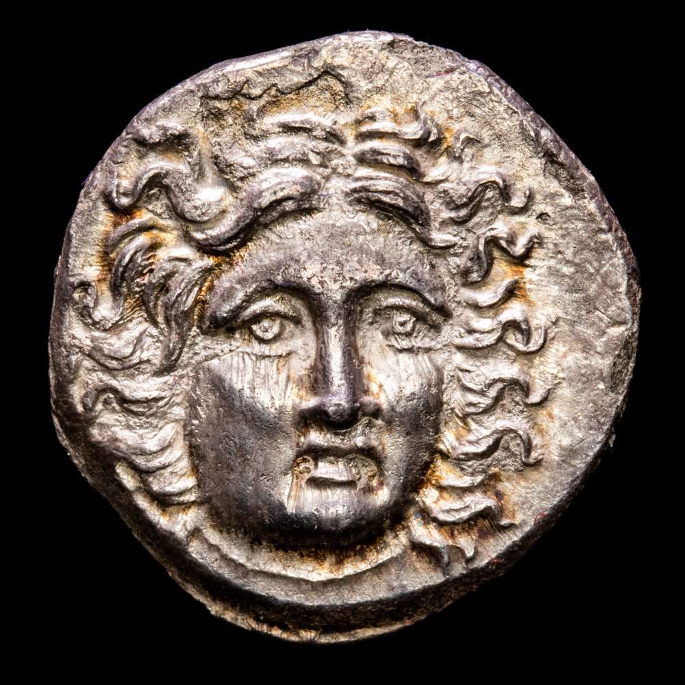 Rodas, dracma, magistrado Hermias, ceca incierta en Tesalia circa 171-170 aC. Acuñado bajo el mando de Perseo durante la Tercera Guerra Macedónica,16,2 mm, 2,56 g. de plata. Cabeza de Helios orientada, ligeramente der. Rosa invertida con capullo a la derecha; arriba, EPMIAΣ y abajo, Z – Ω. SNG Keckman 795. Price: Larissa pl. LV, 247.