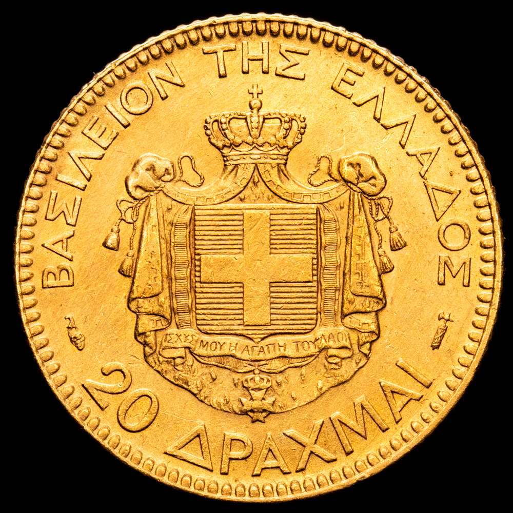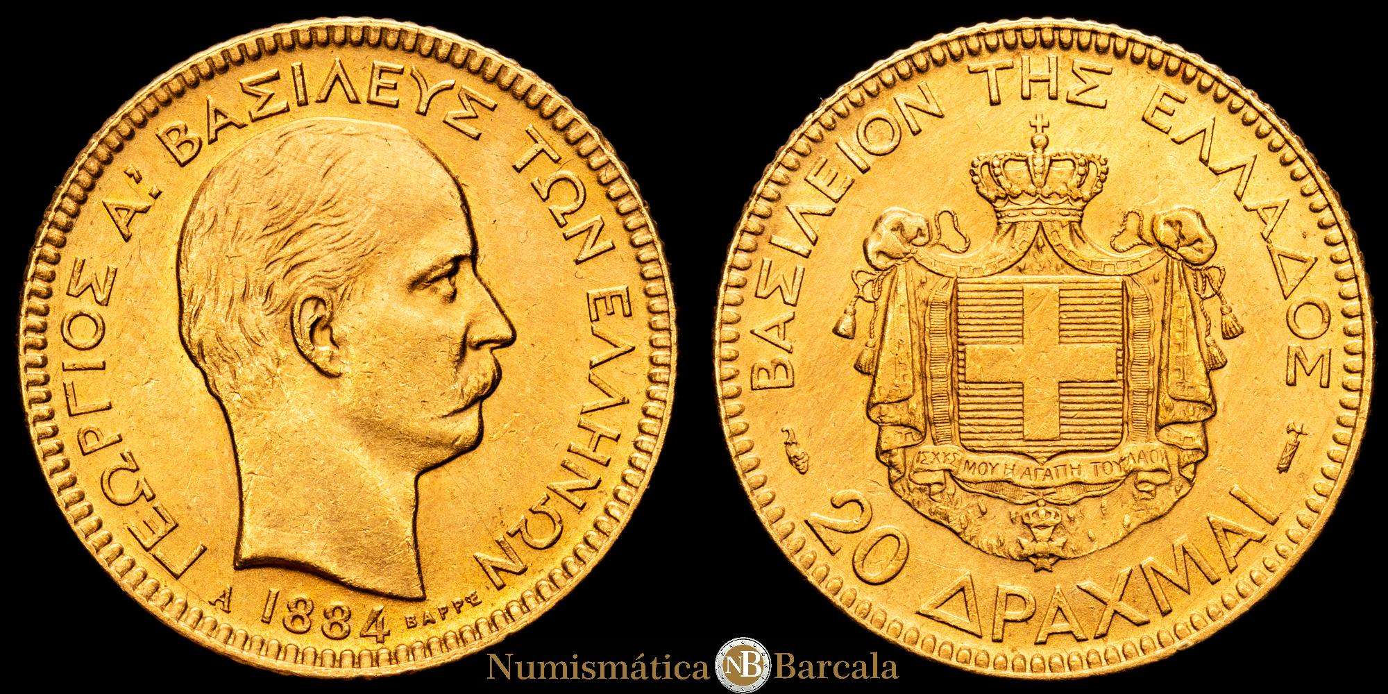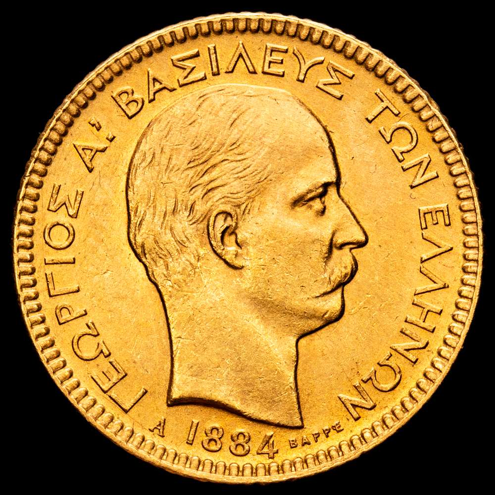 GRECIA, Reino. Georgios I, 1864-1913. 20 Drachmai 1884 A (Oro, 21 mm, 6,45 g, 6 h), París. ΓΕΩΡΓΙΟΣ Α! ΒΑΣΙΛΕΥΣ ΤΩΝ ΕΛΛΗΝΩΝ Cabeza desnuda de Jorge I a la derecha, A 1884 abajo. Rev. ΒΑΣΙΛΕΙΟΝ ΤΗΣ ΕΛΛΑΔΟΣ Armas sobre manto coronado, 20 ΔΡΑΧΜAI abajo. Friedberg 18. Karamitsos 164. XF+.