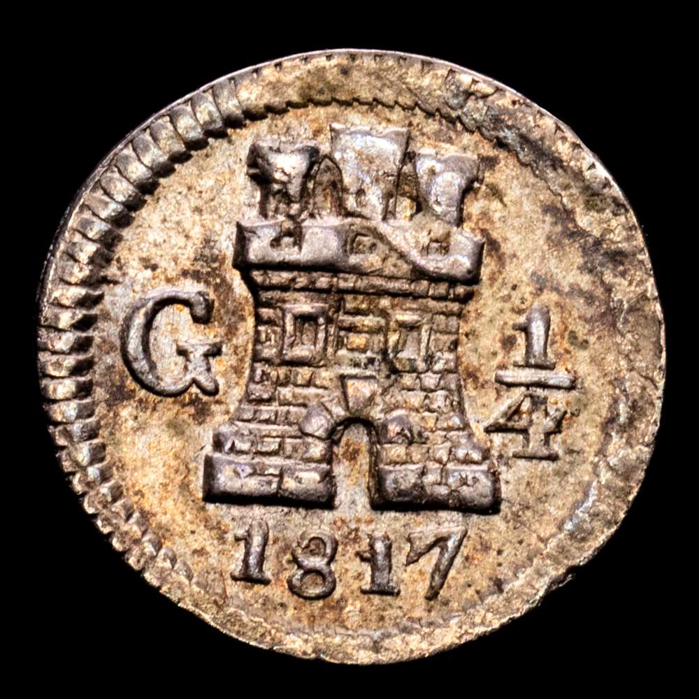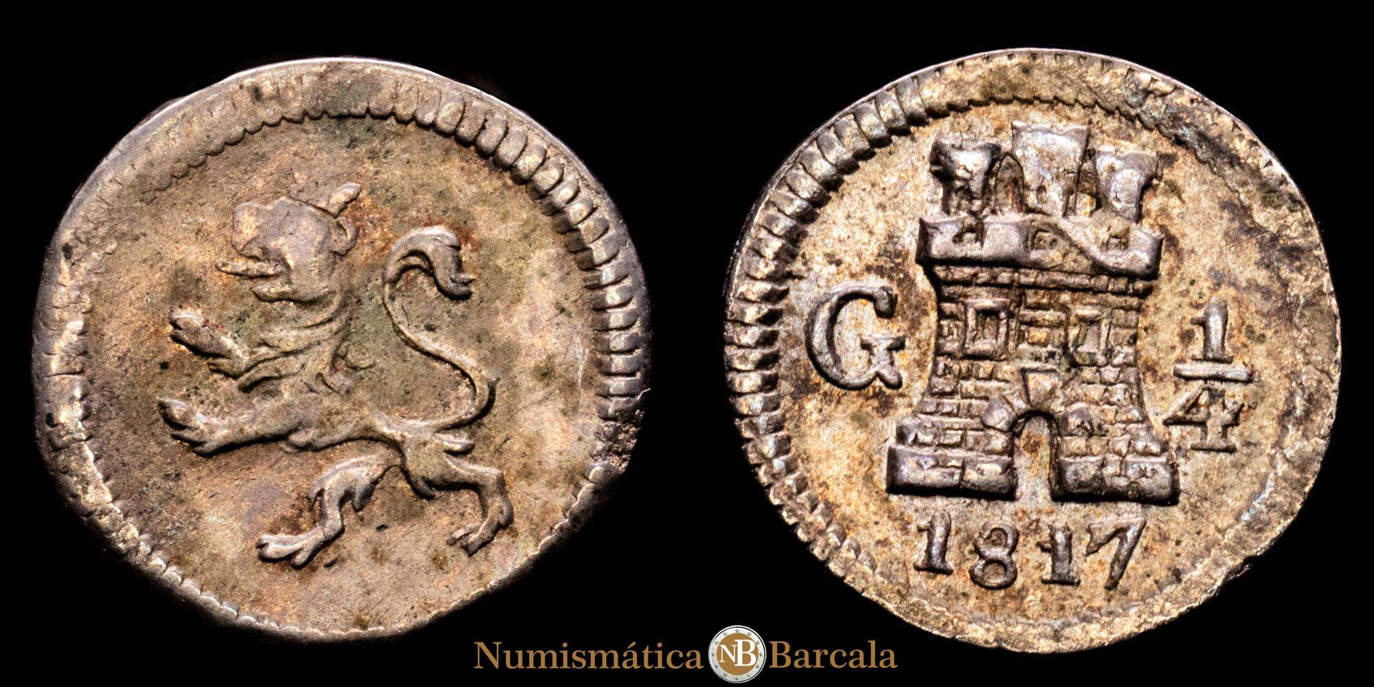 GUATEMALA. Fernando VII (1808-1833). 1817 G. 1/4 de real. 0,79 gramos. (AC.254). Plata. Bonito tono . Muy buen y atractivo ejemplar. Muy rara. EBC+/EBC.