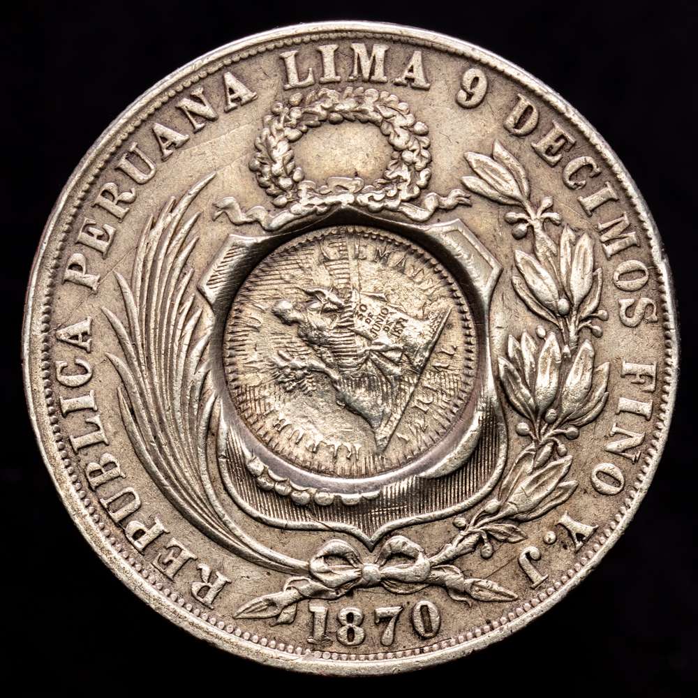 Guatemala – Perú. Peso, 1894. (24,78 gramos). KM-224; Jovel-Tipo VIII. Contramarca: Aplicado a un Sol de la República del Perú YJ de 1870-LIMA (KM-196.3). VF+.