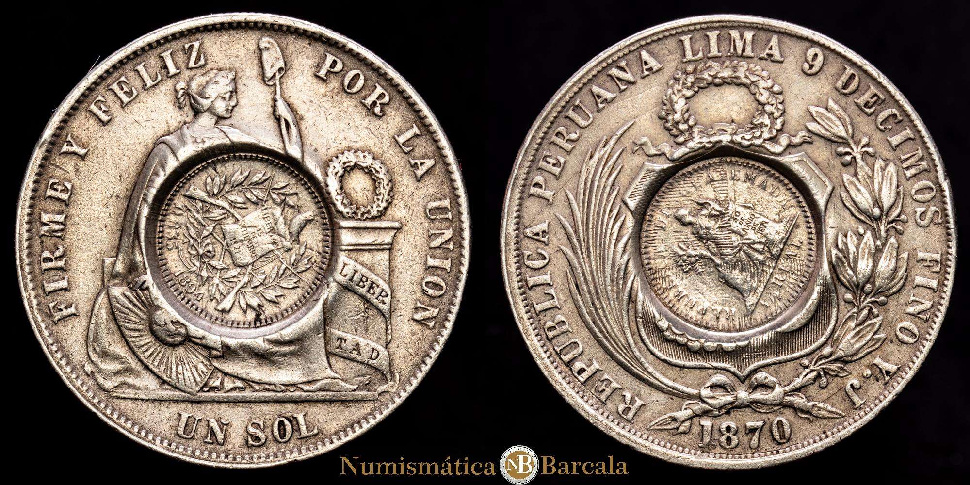 Numismática Barcala > Productos > Guatemala – Perú. Peso, 1894. (24,78 gramos). KM-224; Jovel-Tipo VIII. Contramarca: Aplicado a un Sol de la República del Perú YJ de 1870-LIMA (KM-196.3). VF+.