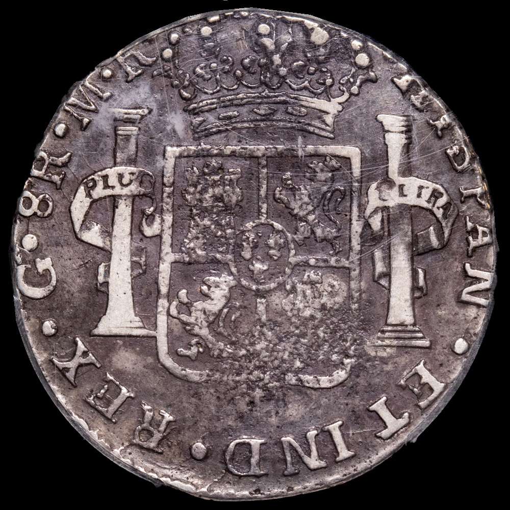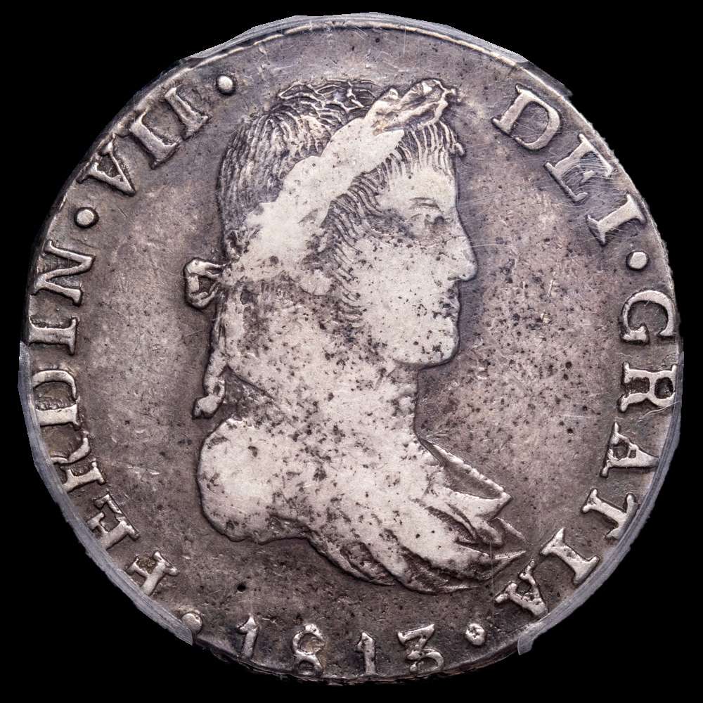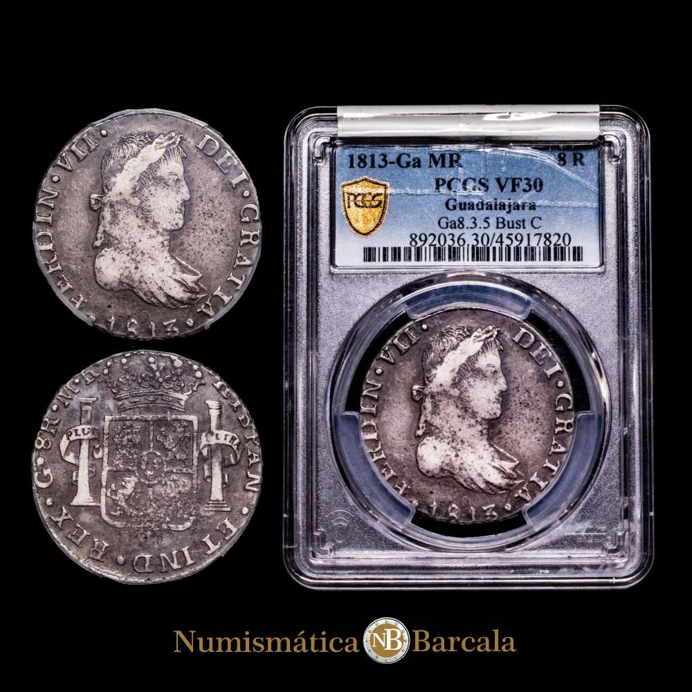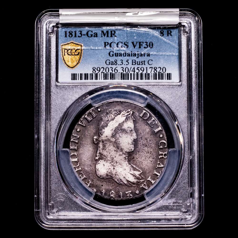 8 Reales Fernando VII, Guadalajara – Moneda realista, 1813, Ga MR. KM-111.3 (AC-1205) – Acuñación tardía, con diseño de busto largo. Pátina oscura. Encapsulada por PCGS como VF30.