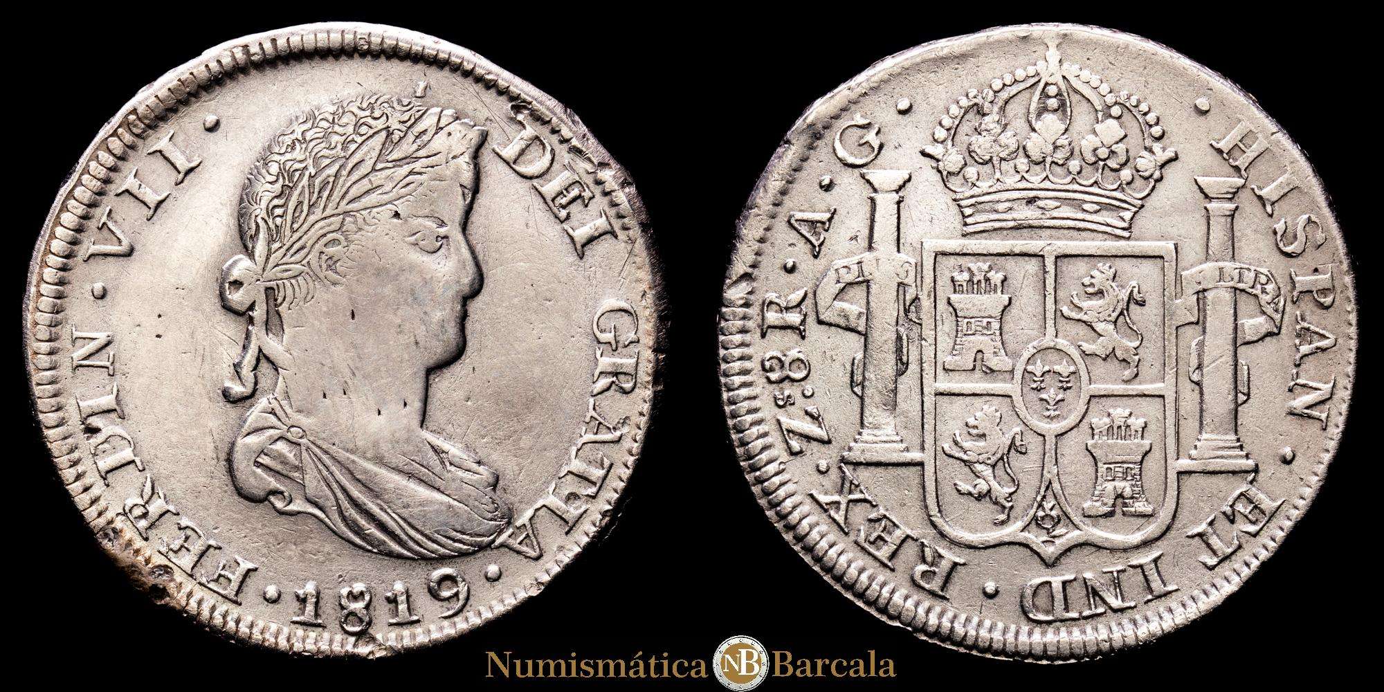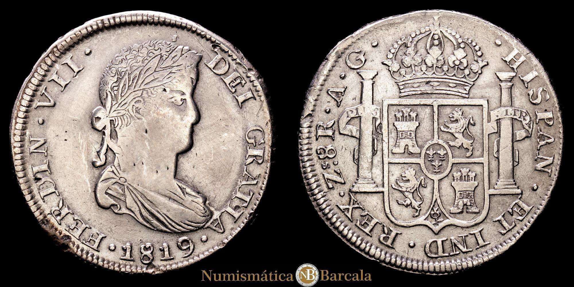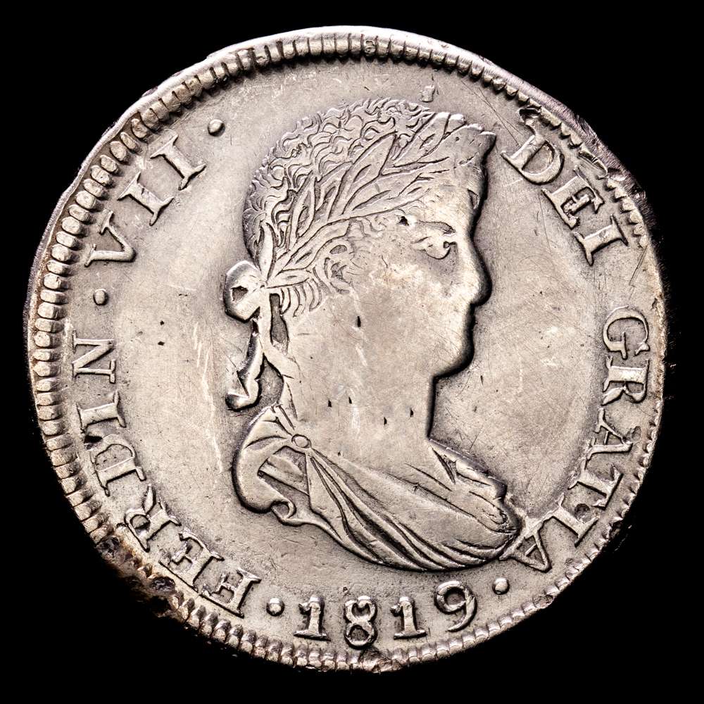 Fernando VII (1808-1833). 8 reales. 1819. Zacatecas. AG. (Cal-1460.1). Ag. 26,54 g. Variedad sin punto entre DEI GRATIA. Escasa. VF+.