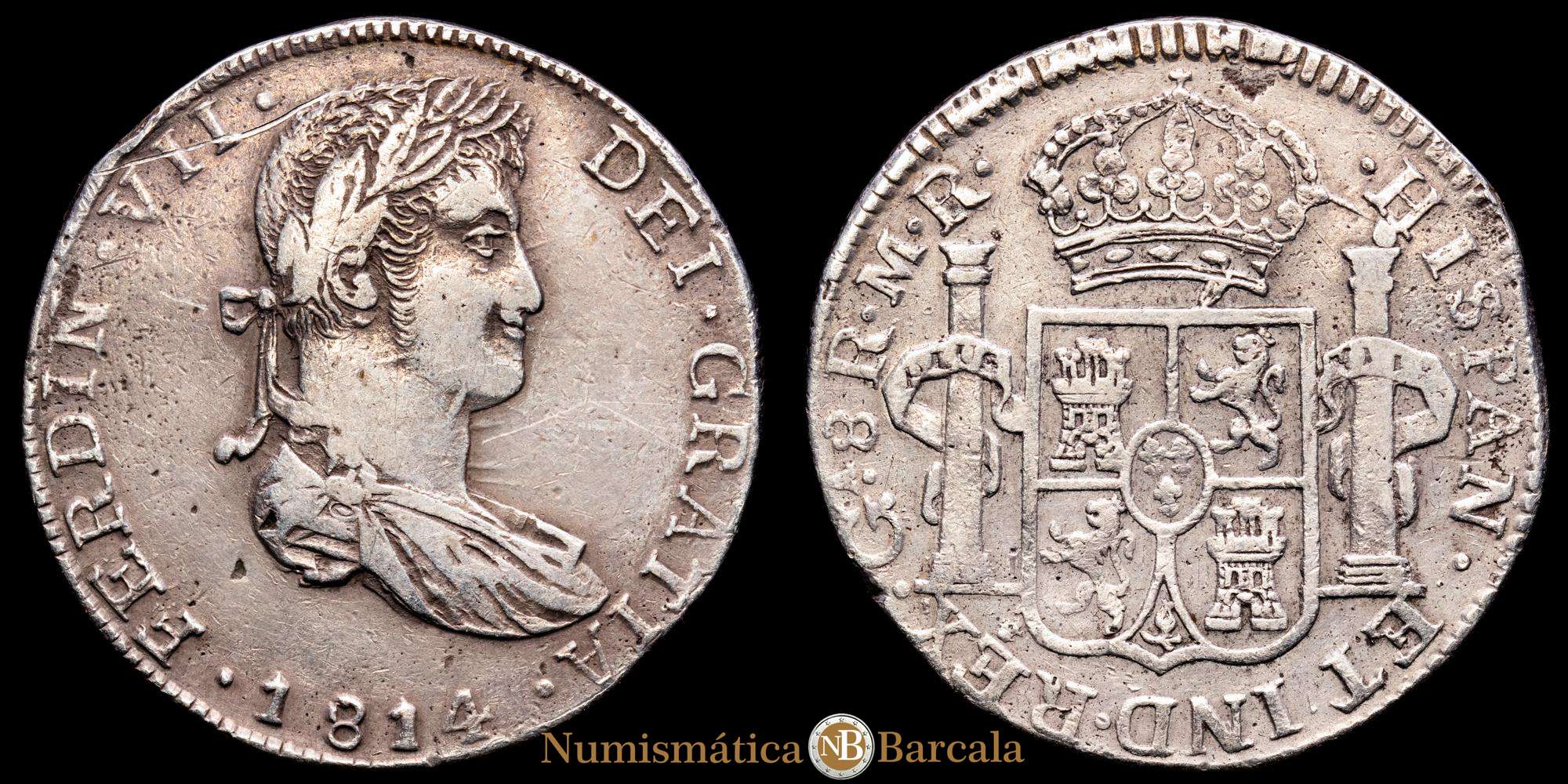Numismática Barcala > Productos > GUERRA DE INDEPENDENCIA. FERNANDO VII. 8 reales. 1814. Guadalajara. MR. AR 27,02 gramos. 38,36 milímetros. VI-1009; AC-1206. VF. Muy escaso.
