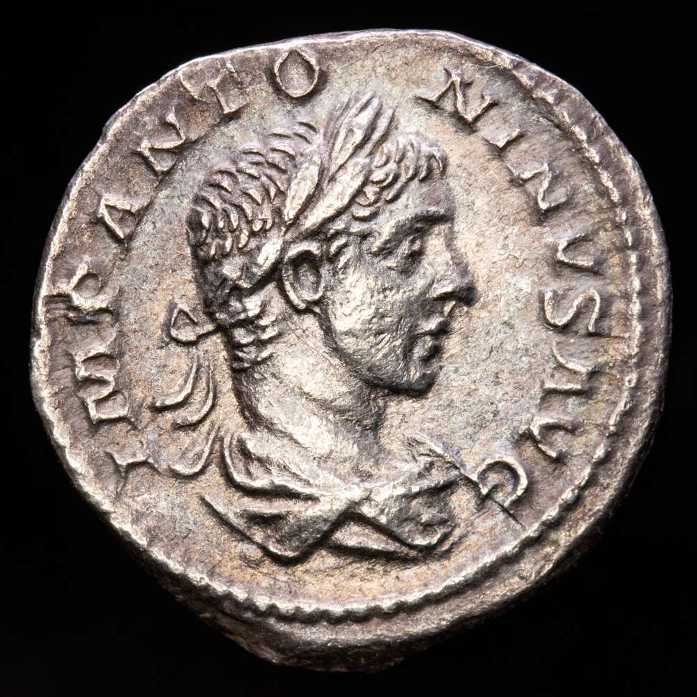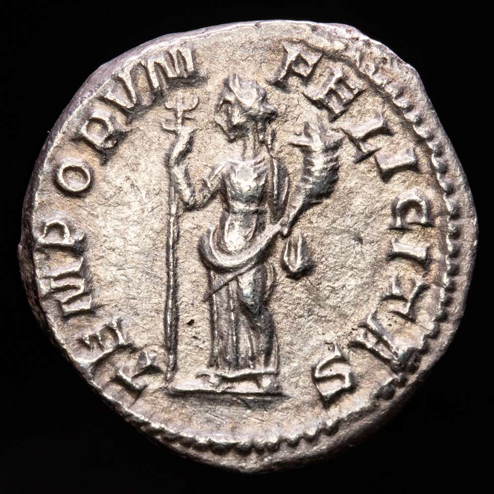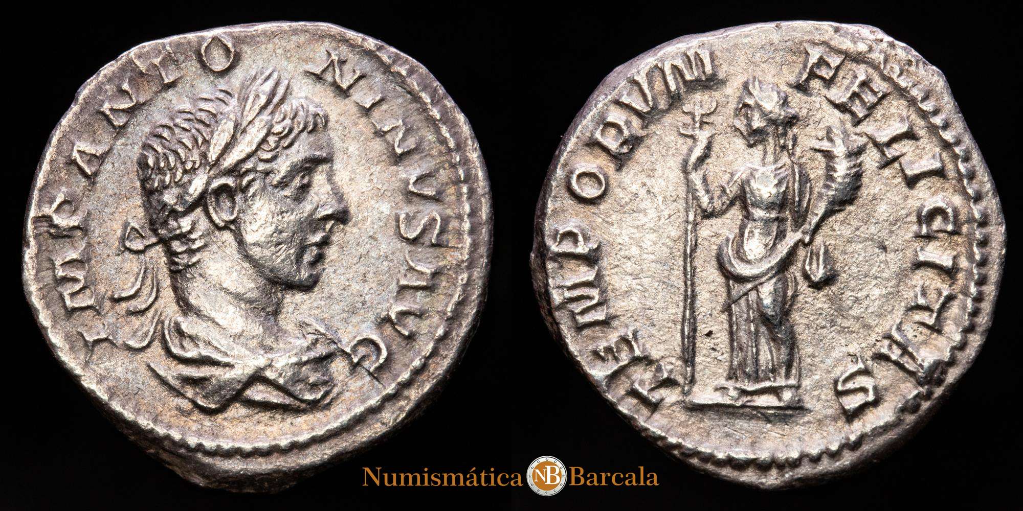 Denario. 219-220 dC HELIOGÁBALO. C-282; RIC-150. Anv.: IMP. ANTONINVS PIVS AVG. Busto laureado a derecha. Rev.: TEMPORVM FELICITAS. Felicidad en pie, cabeza a izquierda, con caduceo y cornucopia. 2,77 grs. Ligeramente tonificada. MBC+.