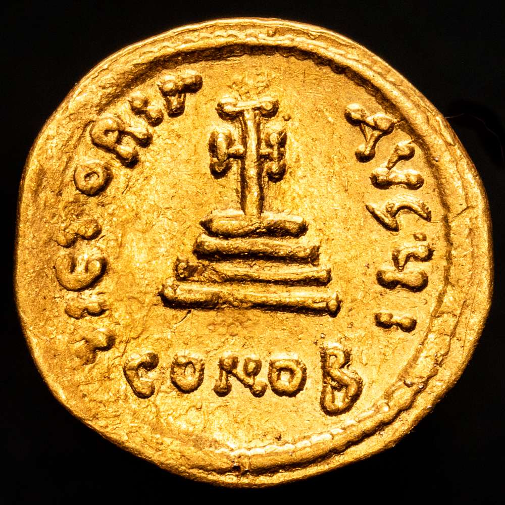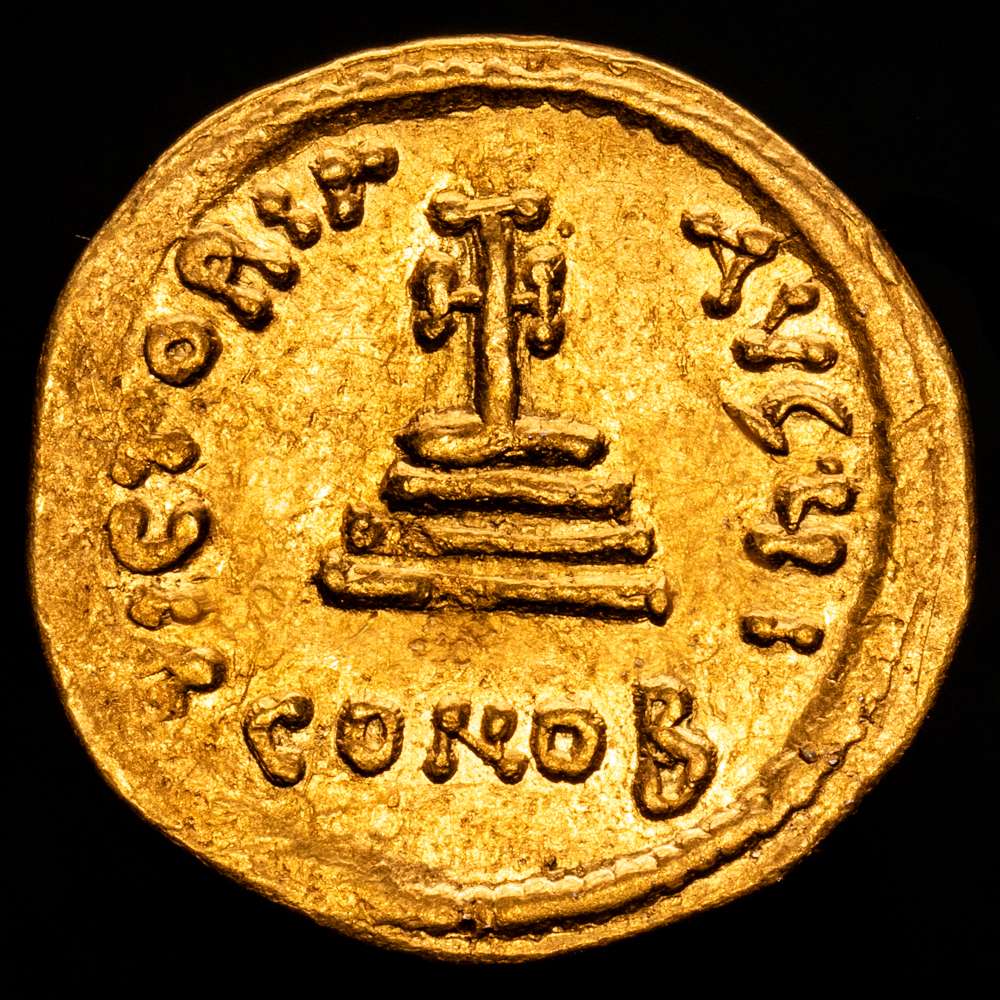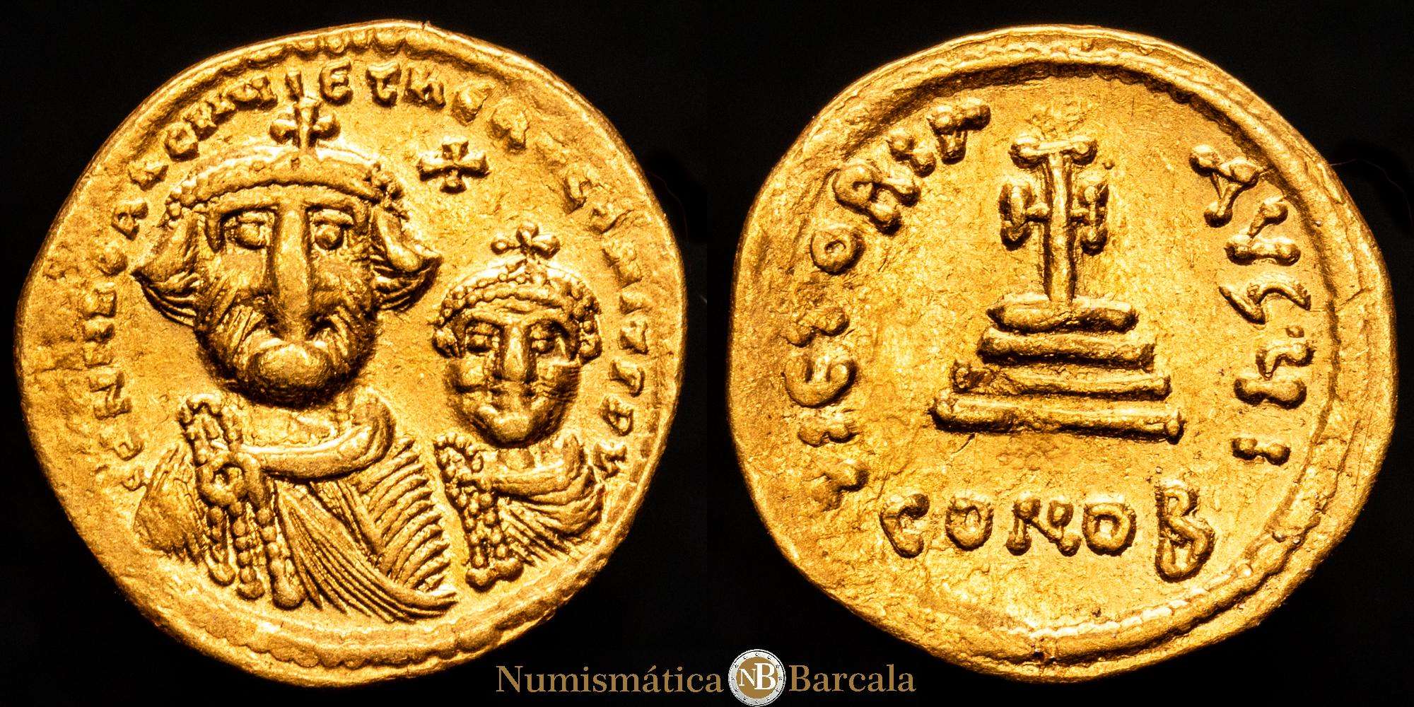 IMPERIO BIZANTINO. HERACLIO (616-625). Sólido. Constantinopla. I. A/ Bustos frontales de los emperadores, en medio cruz. R/ Cruz potenzada sobre gradas, oficina I. AU 4,23 g. 21 mm. (Doc-8h). (MIB-8a). (Sear-734).. B.O. EBC.