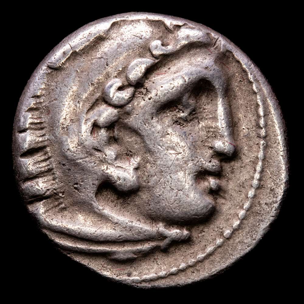 Imperio Macedonio. Alejandro III Magno. Dracma. 323-319 aC Colofón. (Precio-1759). Anv.: Cabeza de Heracles a derecha recubierta con piel de león. Rev.: Zeus sentado a izquierda con cetro y águila, delante estrella y detrás punta de lanza. Ag. 4,27 gramos. MBC.