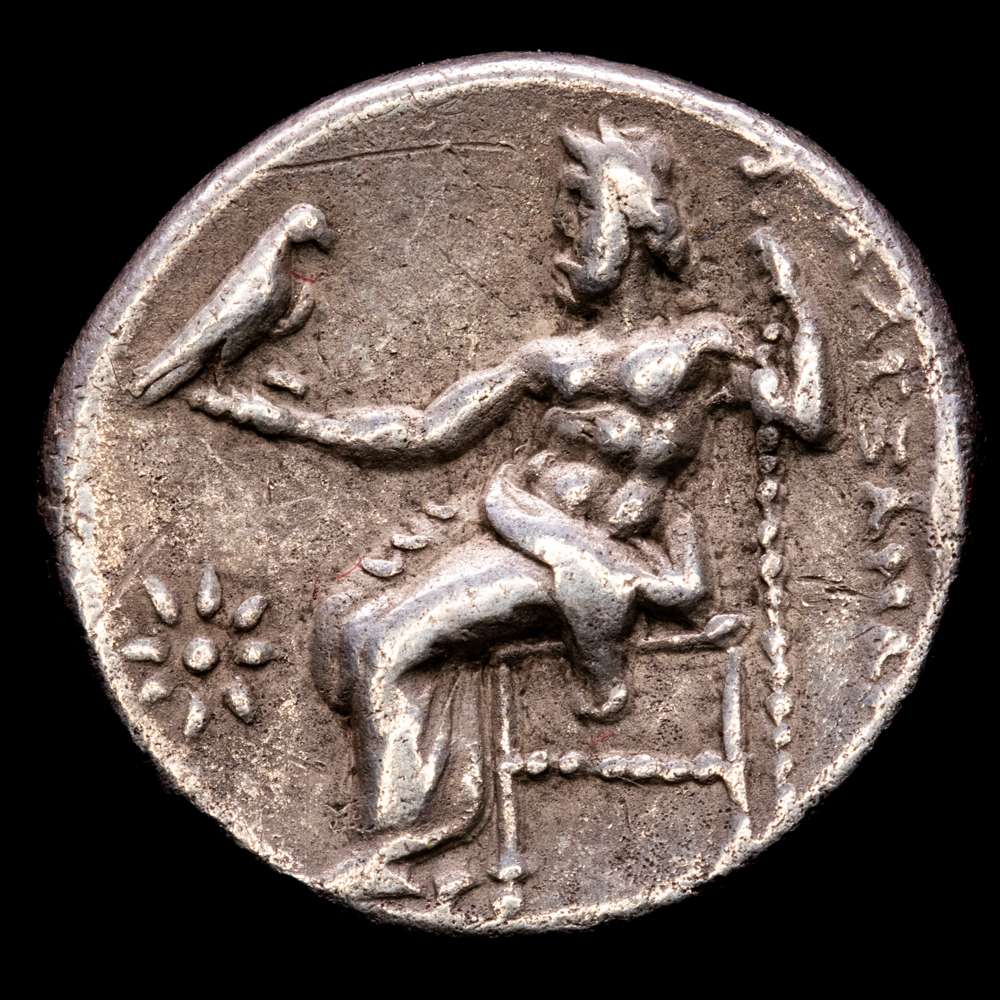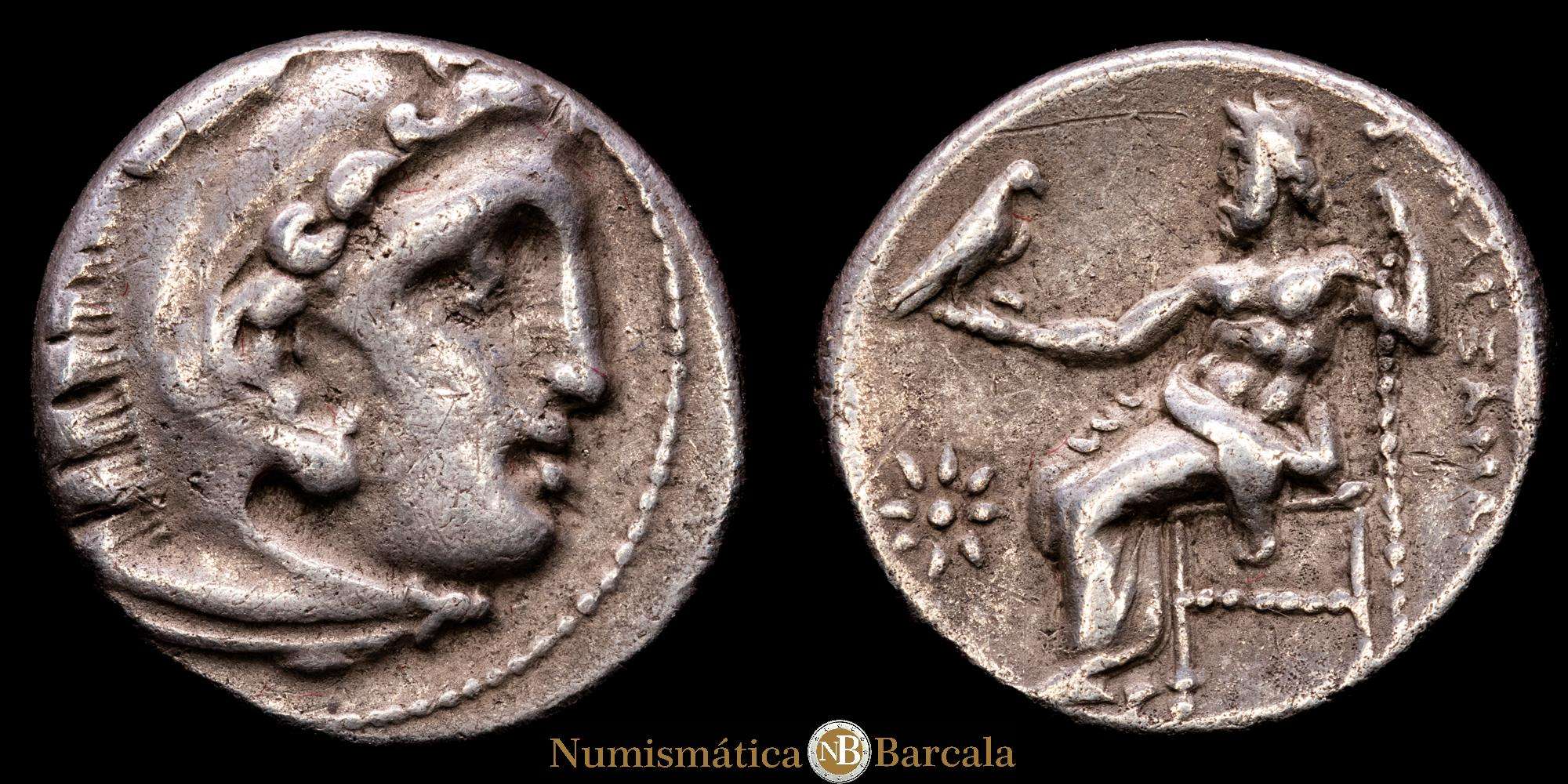 Imperio Macedonio. Alejandro III Magno. Dracma. 323-319 aC Colofón. (Precio-1759). Anv.: Cabeza de Heracles a derecha recubierta con piel de león. Rev.: Zeus sentado a izquierda con cetro y águila, delante estrella y detrás punta de lanza. Ag. 4,27 gramos. MBC.