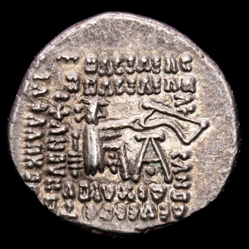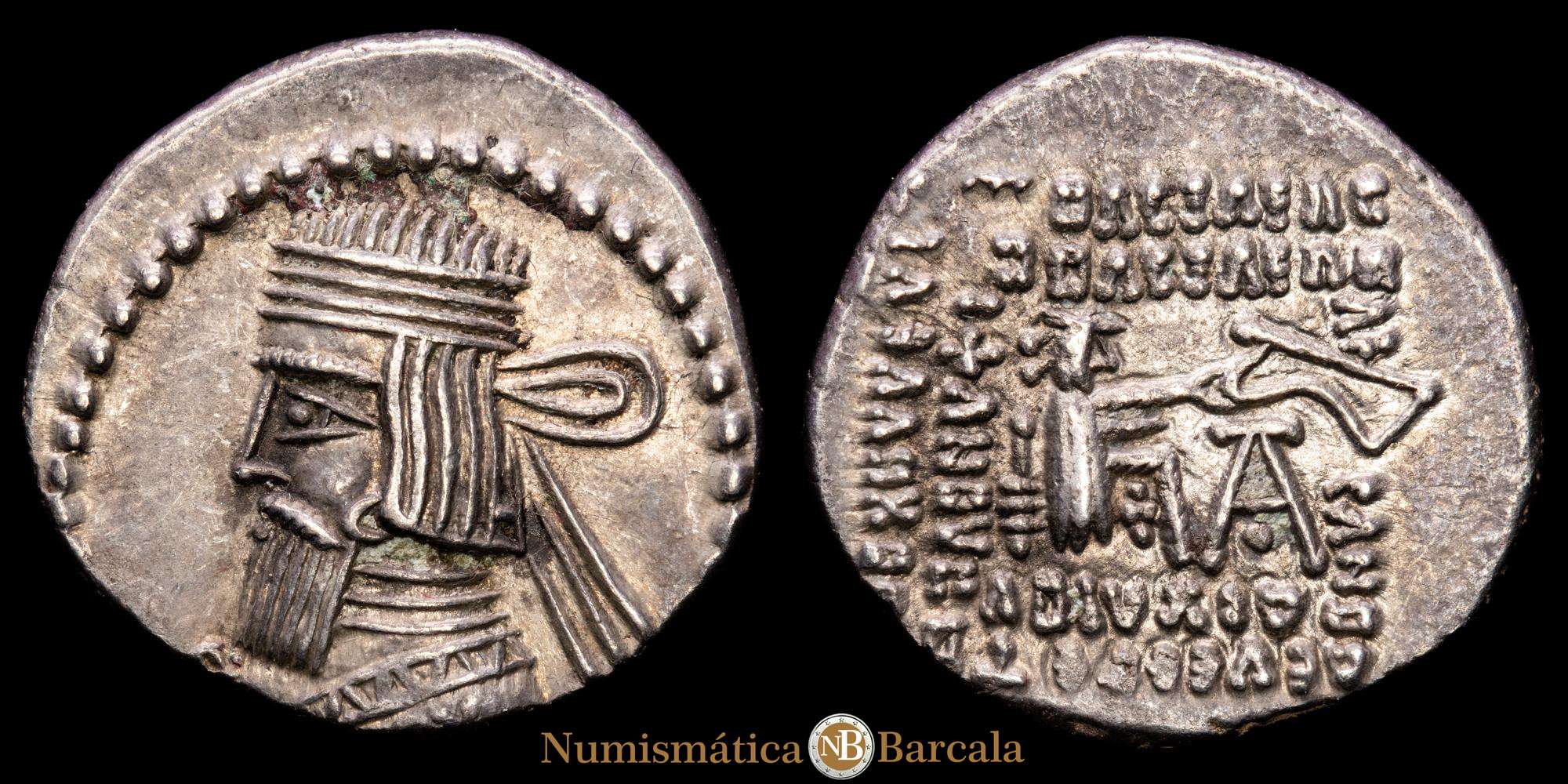 Imperio Parto. Vologases III. Dracma-dracma. 105-47 aC (Gc-5831 similar). Anv.: Busto diademado a izquierda. Rev.: Arquero sentado a derecha, alrededor de leyenda. Ag. 3,51 gramos. EBC.