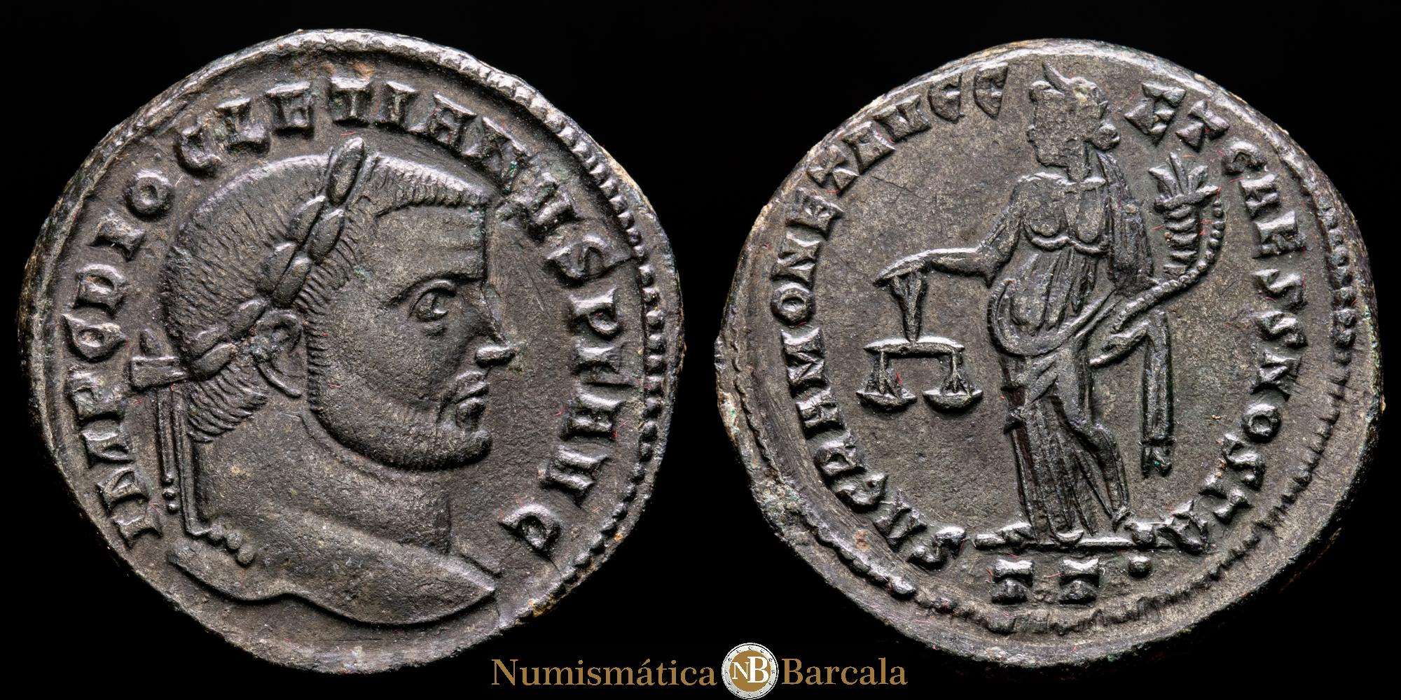 Numismática Barcala > Productos > Imperio Romano Diocleciano. Follis. 300-03 dC Ticinio. (Spink-12821). (Ric-439). Rev.: SACRA MONETA AVGG ET CAES NOSTR. En exergo TT. Ae. 11,11 gramos. VF+