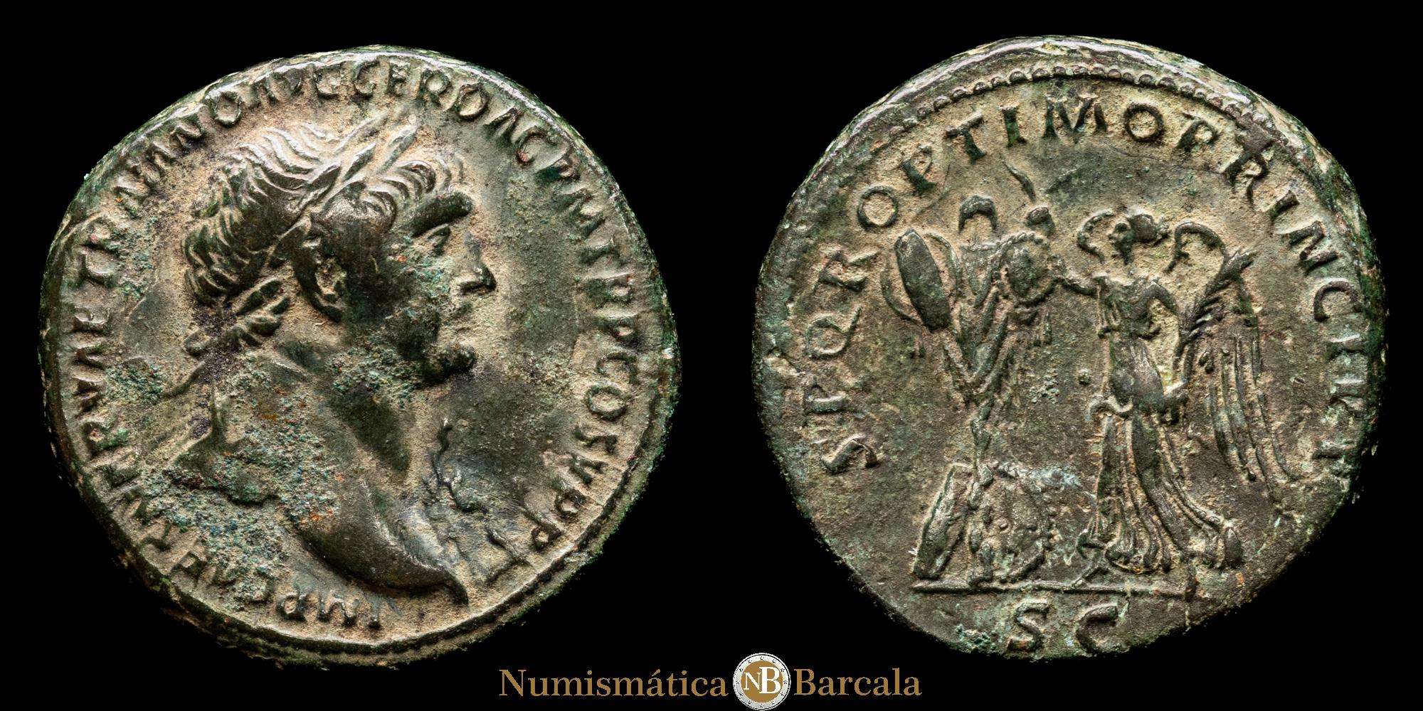 Numismática Barcala > Productos > Imperio Romano. Trajano, 98-117 d. C. Bronce, Dupondio. (12,87 g – 28,00 mm). Roma. 103-111 d. C. RIC II 525. Excelente estado. Bella pátina.