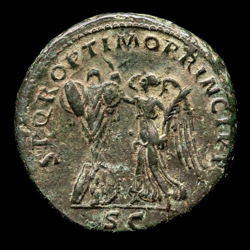 Reverso: SPQR OPTIMO PRINCIPI. Victoria de pie a la izquierda, erigiendo un trofeo con la mano derecha y sosteniendo una palma en la izquierda; SC en el exergo.