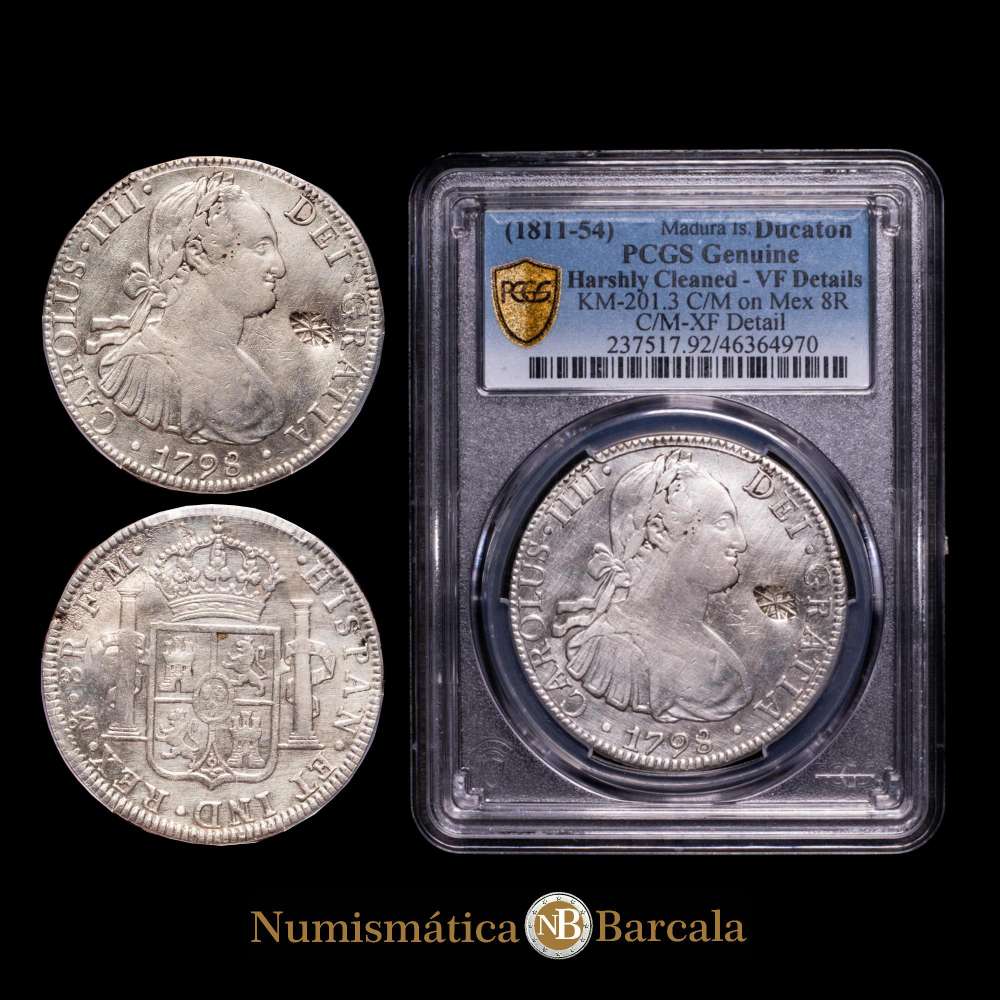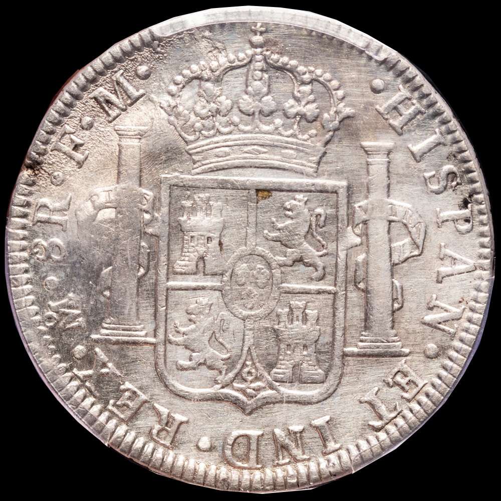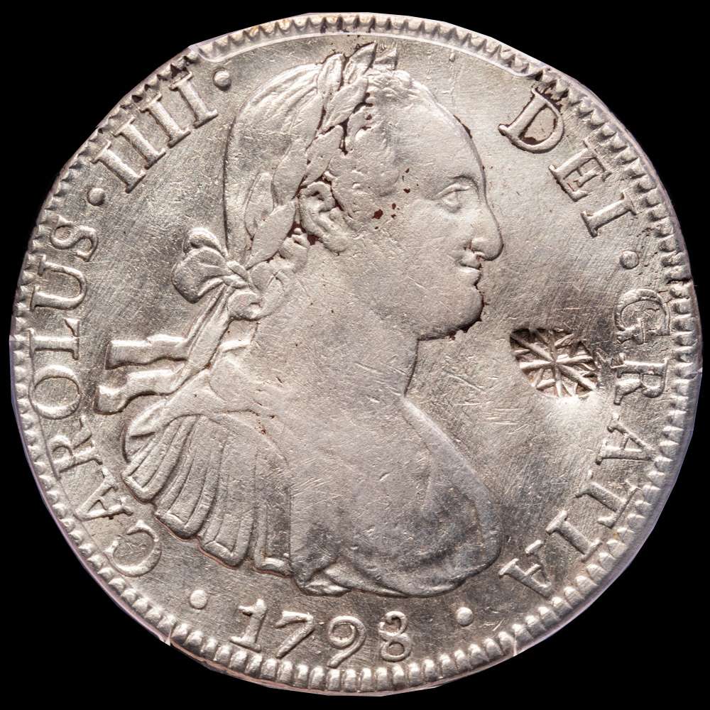 KM-201.3. Contramarca: Variedad S1d; Diseño similar a una flor. Aplicado al anverso de un busto mexicano de 1798-Mo FM de 8 reales de Carlos III (IV) (KM-109). Aunque se ha limpiado hasta obtener un brillo uniforme, esta pieza conserva detalles bastante fuertes y una contramarca clara.