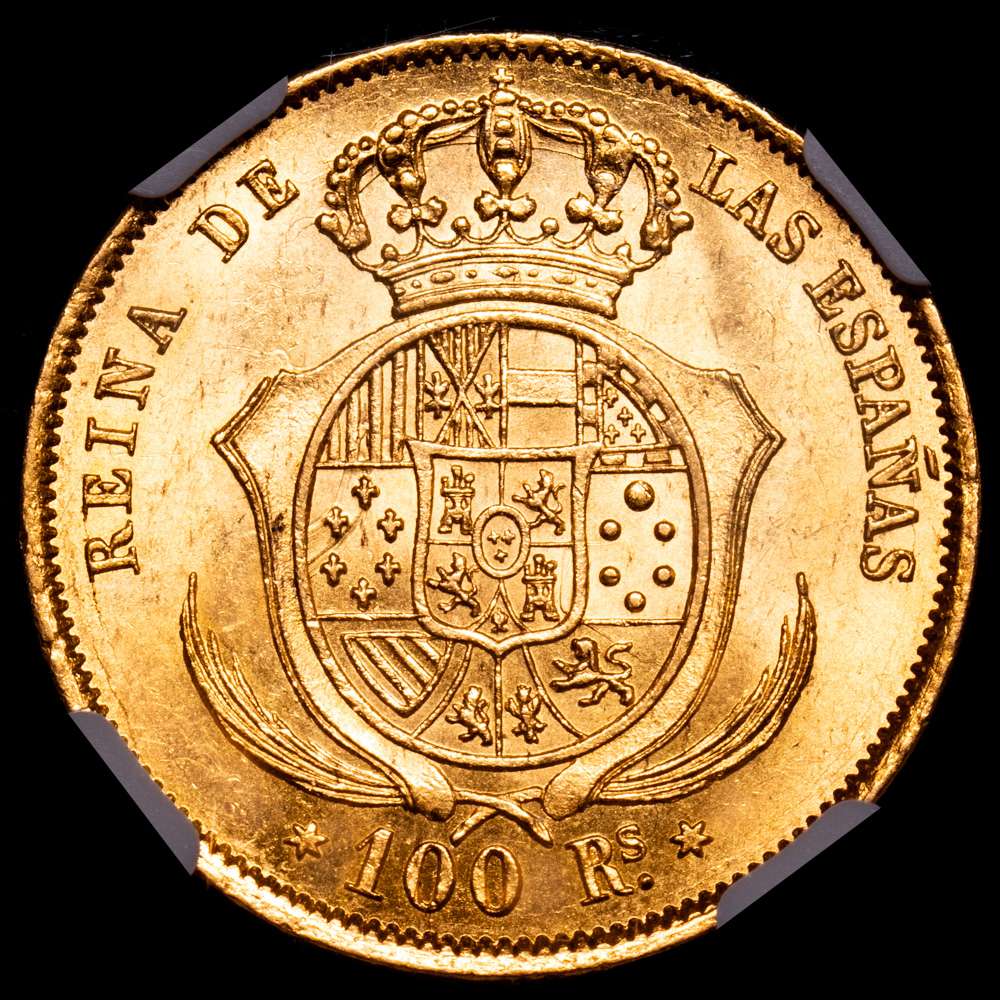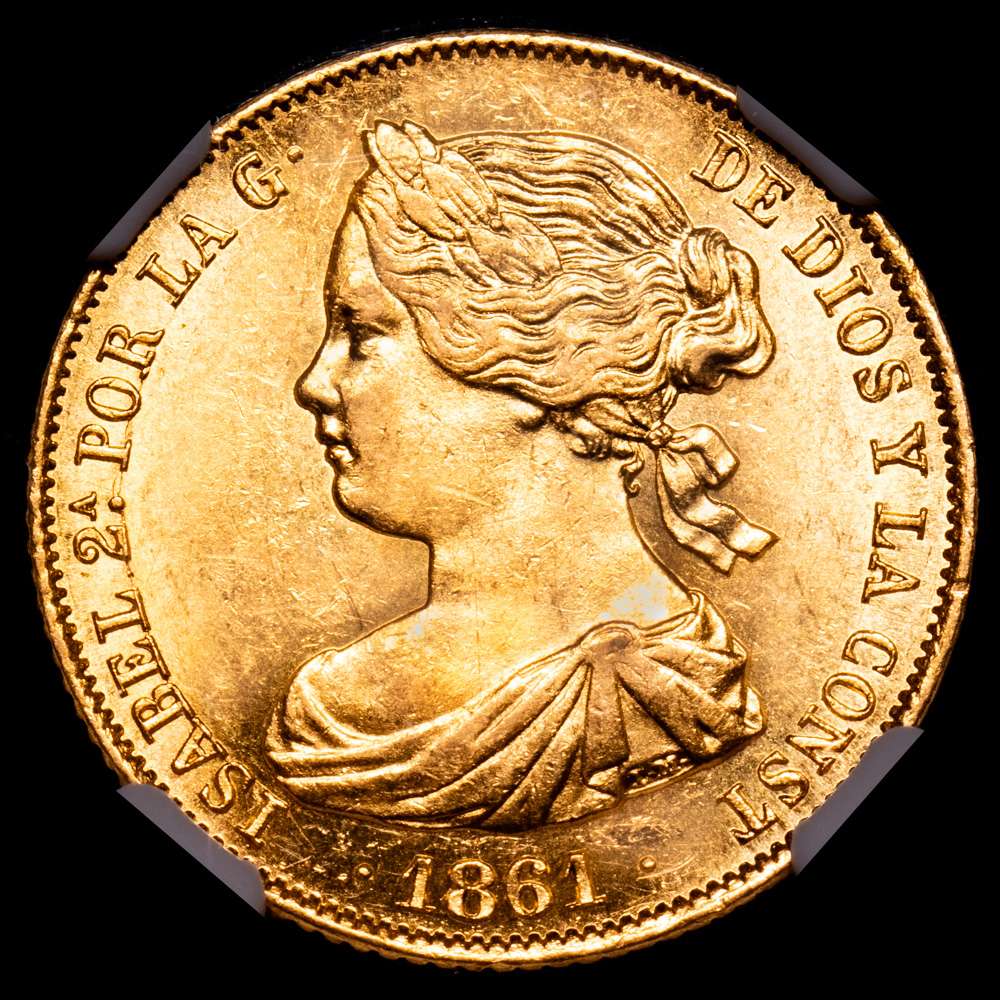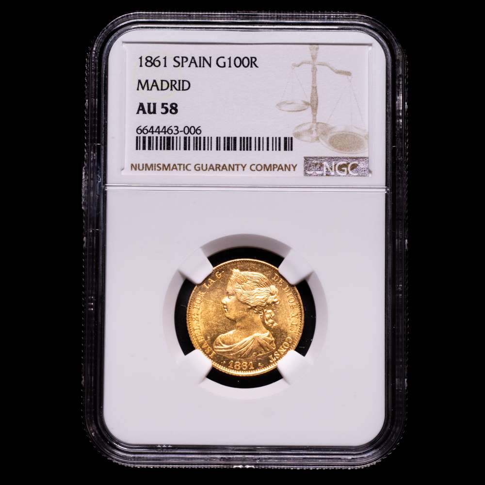 Numismática Barcala > Productos > Isabel II. 100 Reales. (8,40 g.). Madrid. 1861. AC-788. Encapsulada por NGC como AU58. Brillo original.