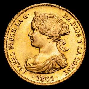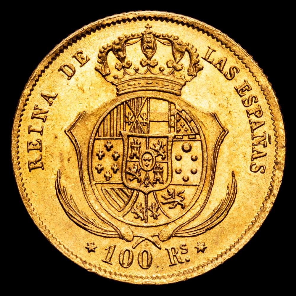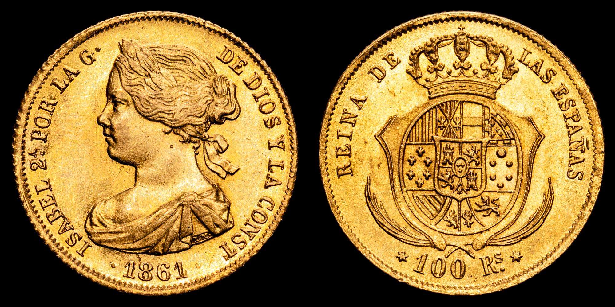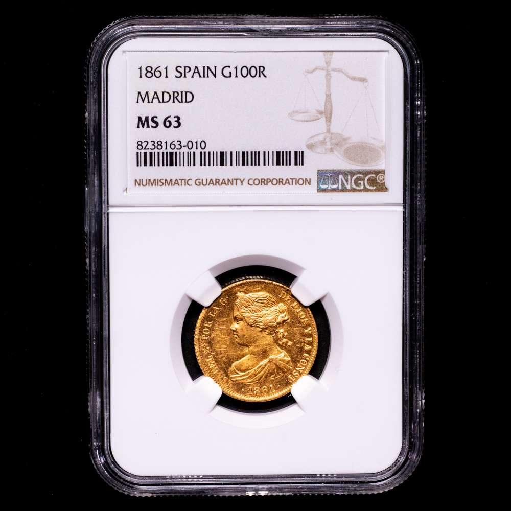 Isabel II. 100 Reales. (8,41 g.). Madrid. 1861. AC-788. Encapsulada por NGC como MS63. Brillo original. Escasa así.
