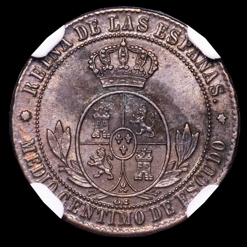 Isabel II (1833-1868). 1/2 céntimo de escudo. 1868. Barcelona. OM. (Cal-201). Ae. Encapsulada por NGC como MS 61 BN.