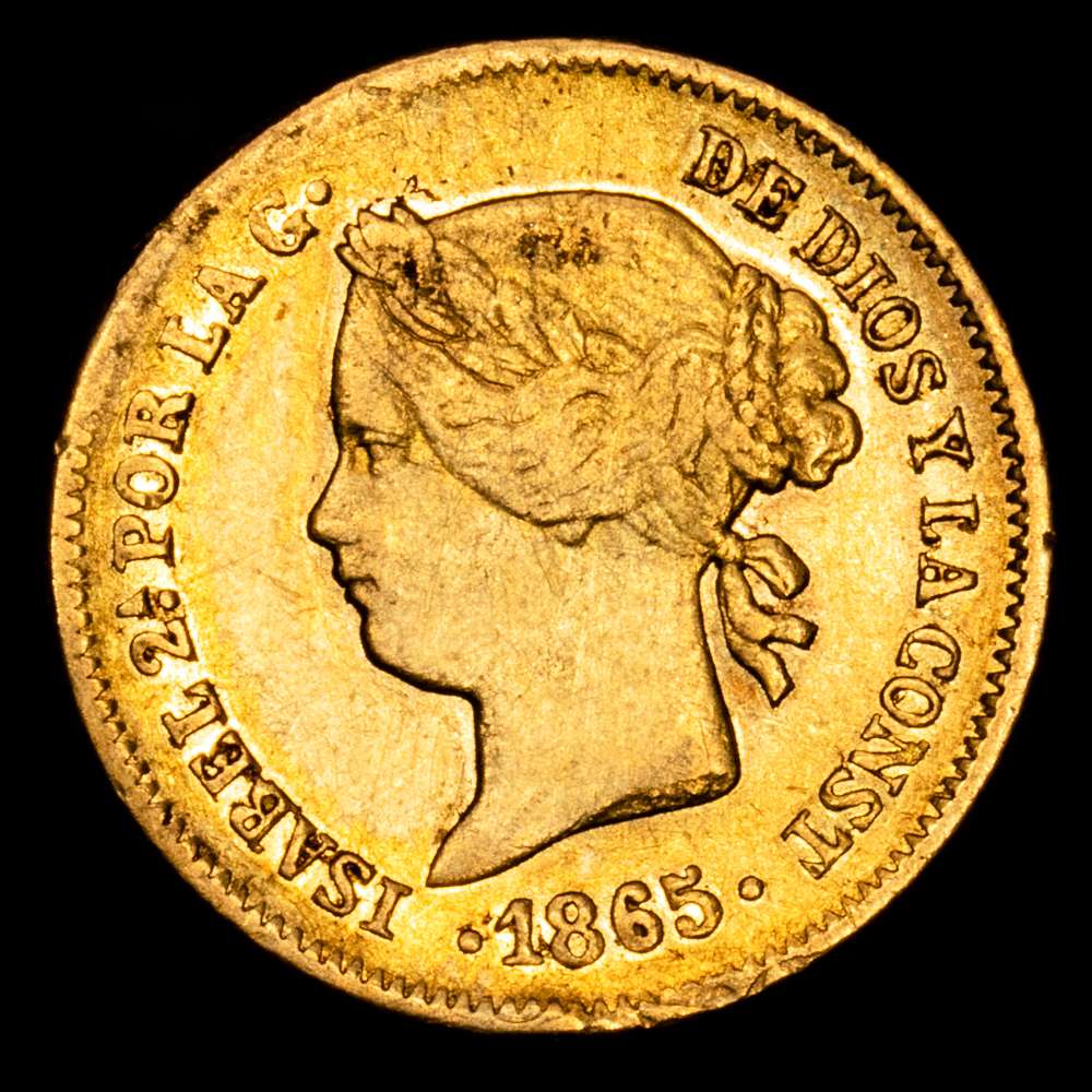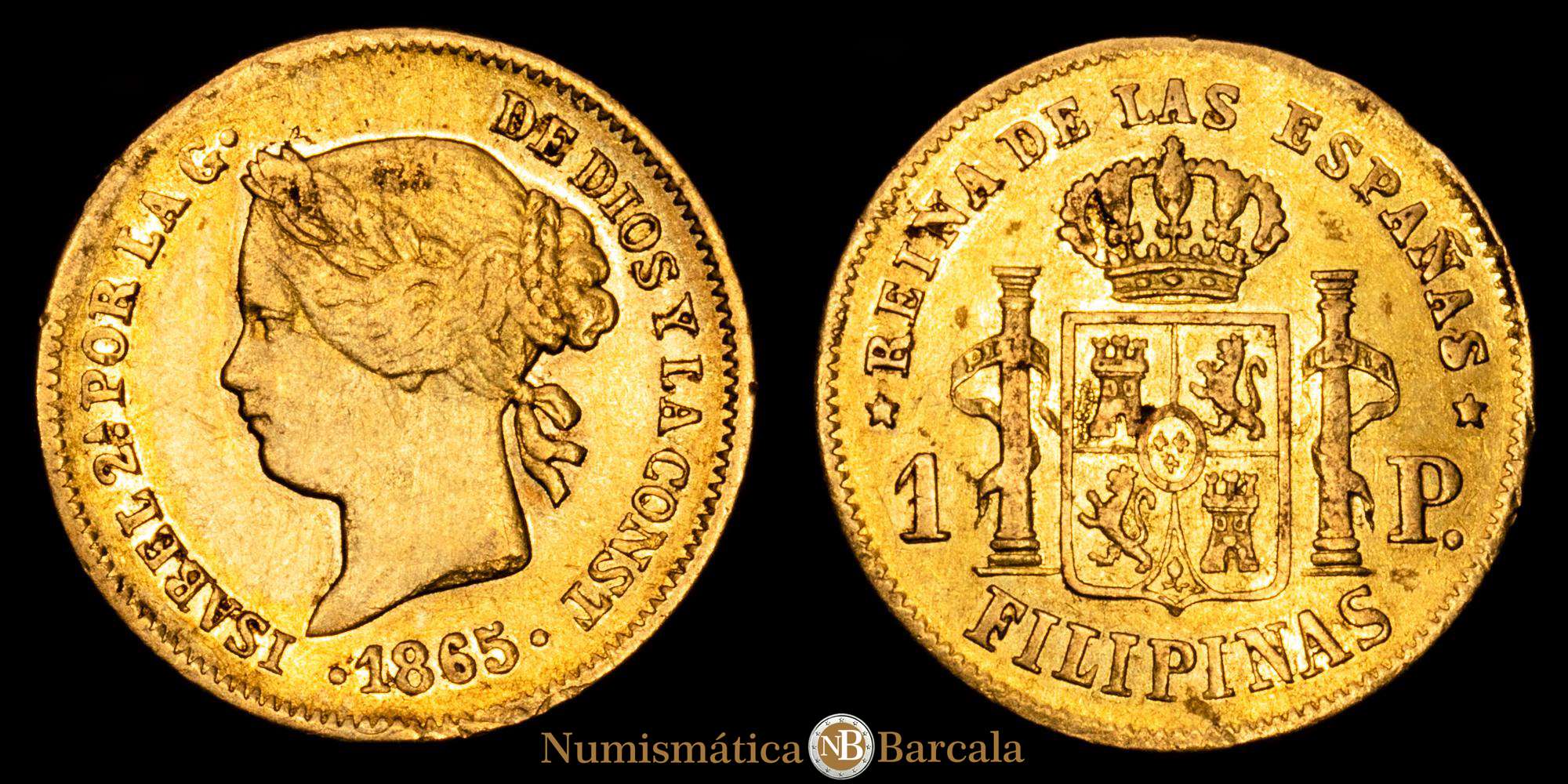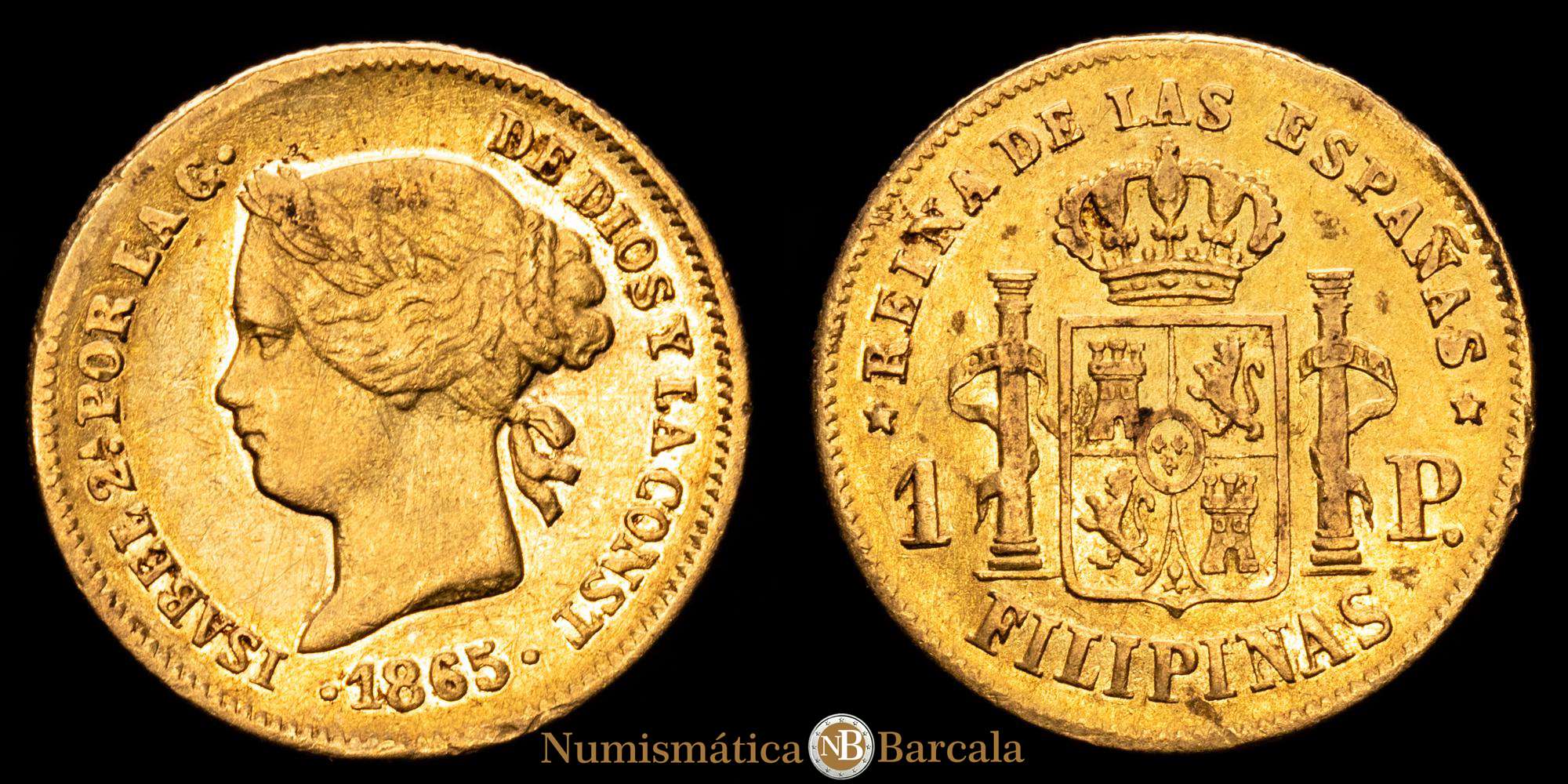 Numismática Barcala > Productos > Isabel II (1833-1868). 1 Peso. 1865. Manila. (Cal-829). Au. 1,69 gramos. Leves restos de brillo originales. Escasa. MBC+.