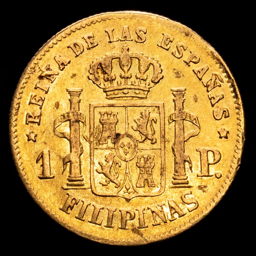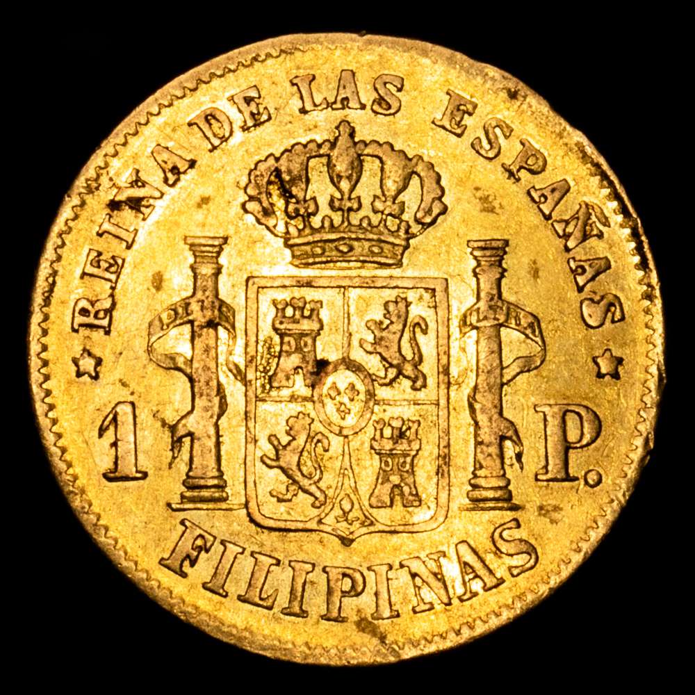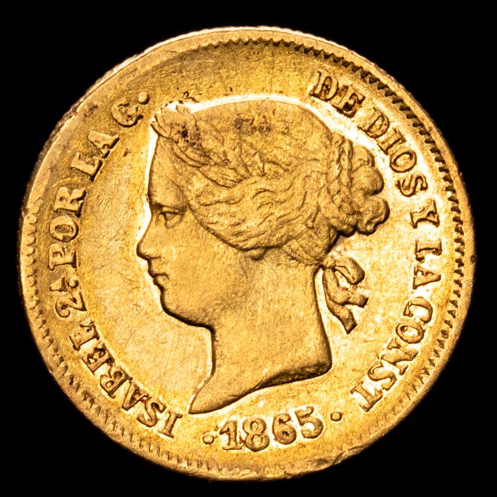 Numismática Barcala > Productos > Isabel II (1833-1868). 1 Peso. 1865. Manila. (Cal-829). Au. 1,69 gramos. Leves restos de brillo originales. Escasa. MBC+.