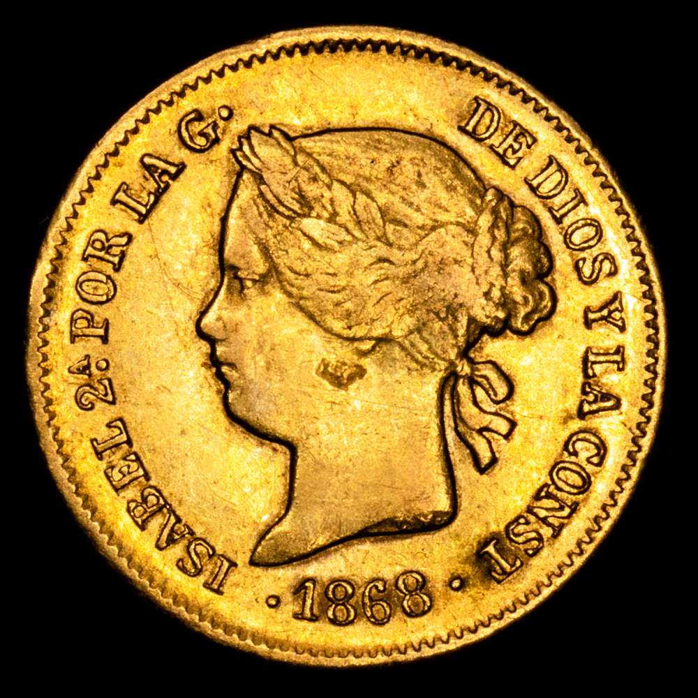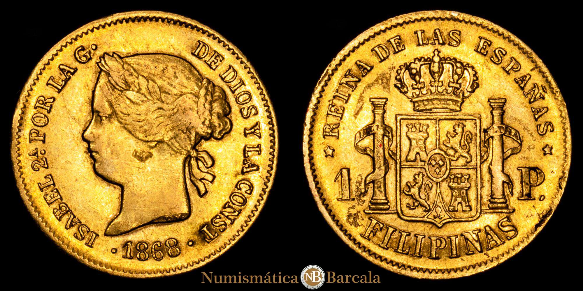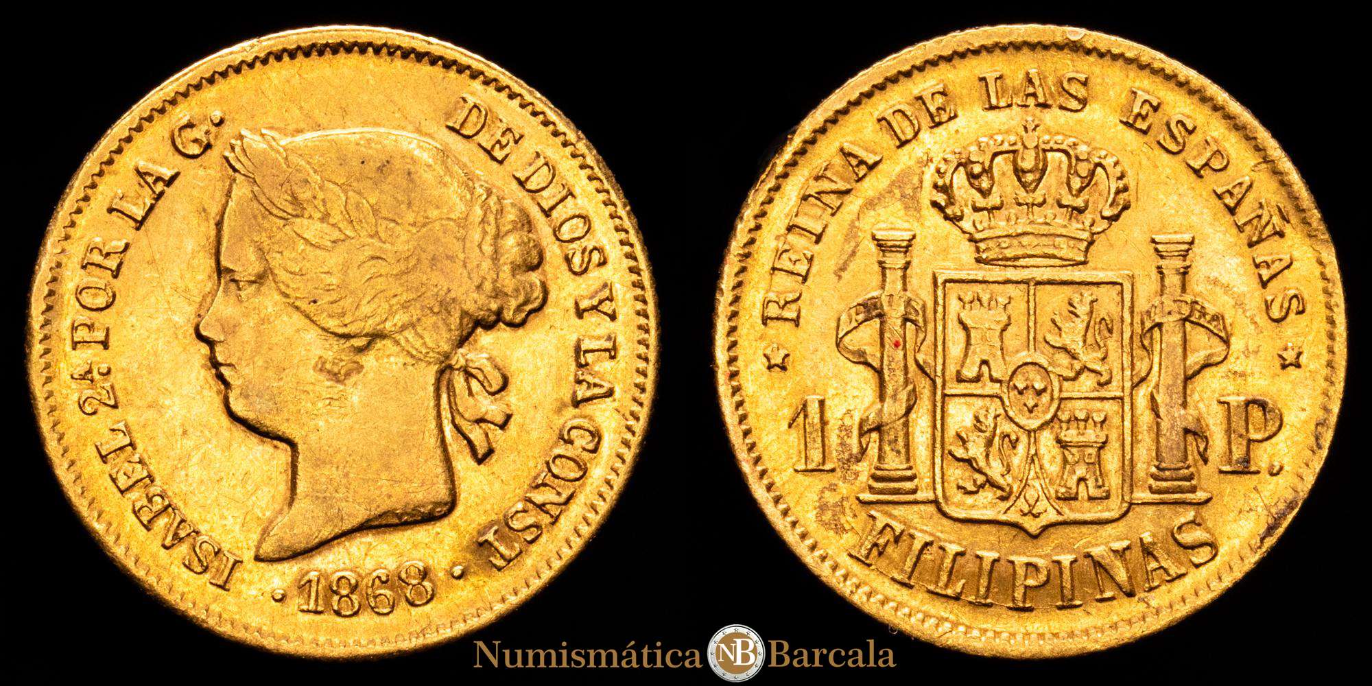 Isabel II (1833-1868). 1 peso. 1868. Manila. (Cal-833). Au. 1,66 g. MBC+. Hojita en anverso.