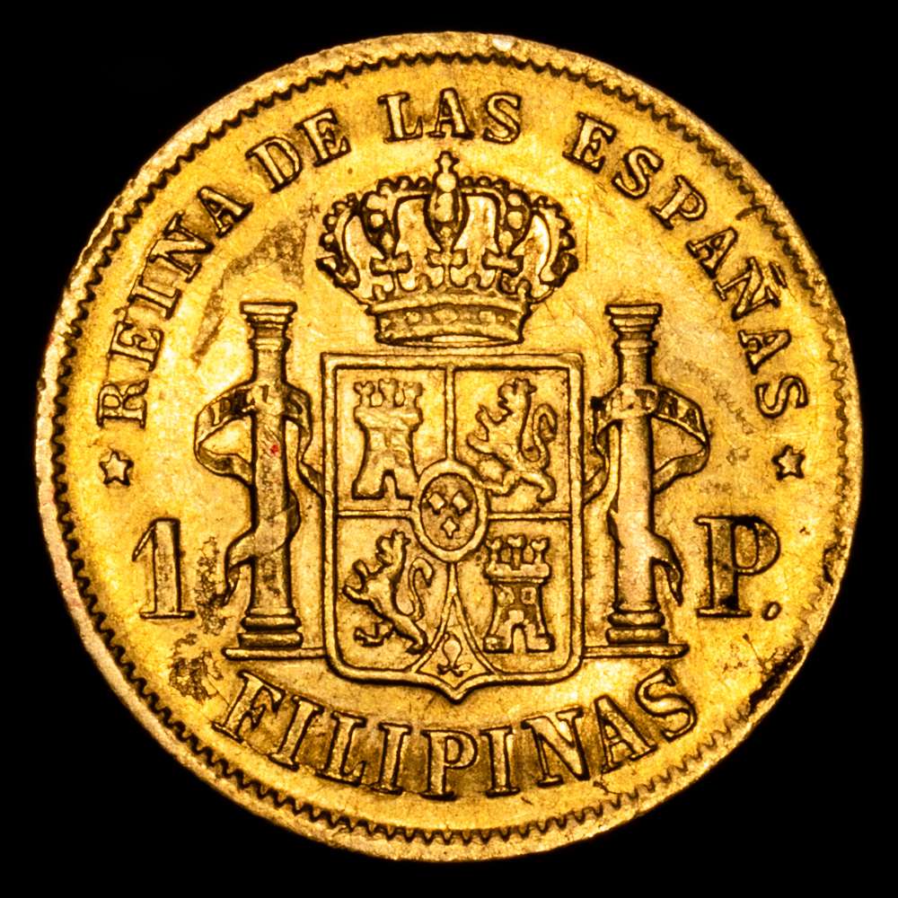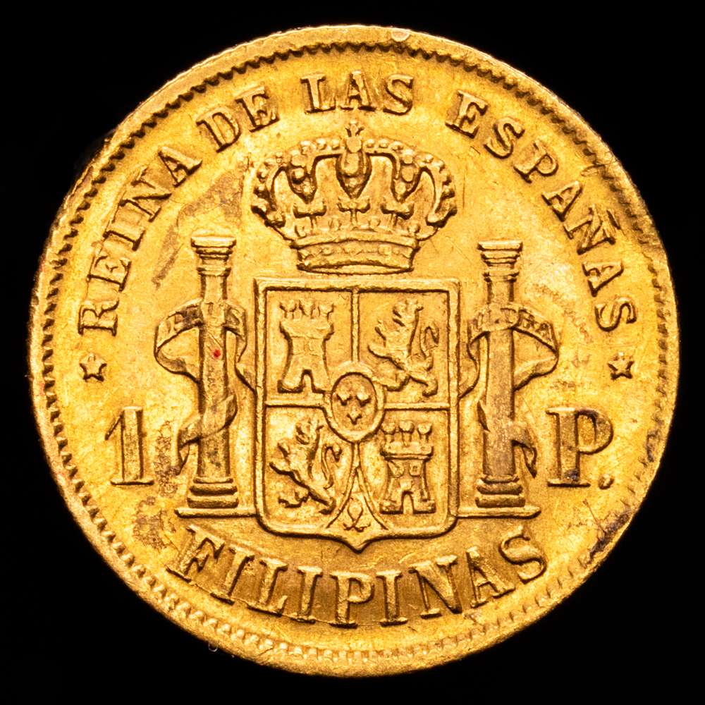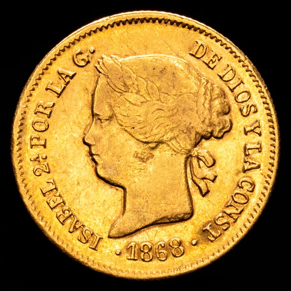 Isabel II (1833-1868). 1 peso. 1868. Manila. (Cal-833). Au. 1,66 g. MBC+. Hojita en anverso.