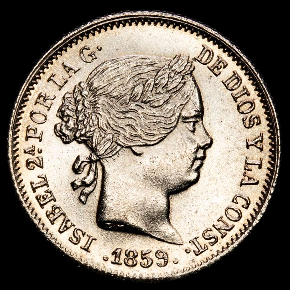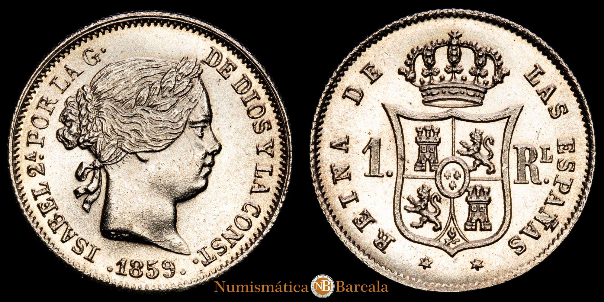 Numismática Barcala > Productos > Isabel II (1833-1868). 1 real. 1859. Madrid. (Cal-308). Ag. 1,35 gramos. Gran parte de brillo original. Precioso ejemplar. SC-.